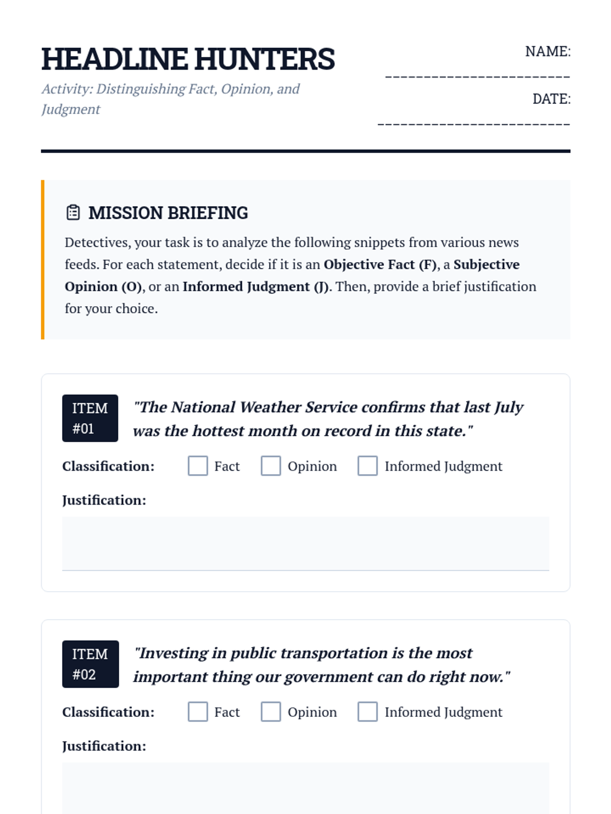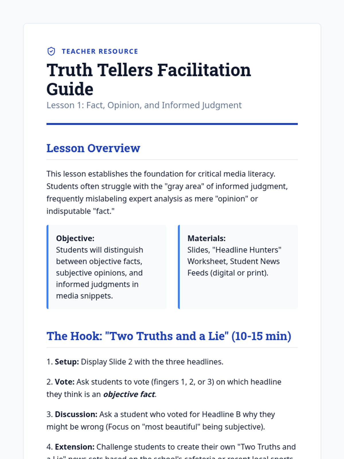 A 10th-grade English sequence focused on media literacy, helping students distinguish between fact and opinion, identify claims, analyze rhetorical appeals, and detect bias in persuasive texts.