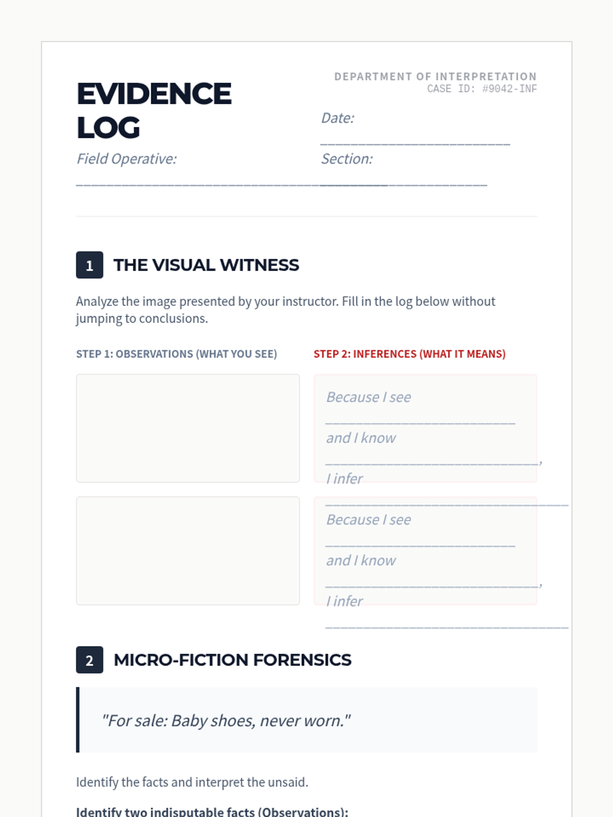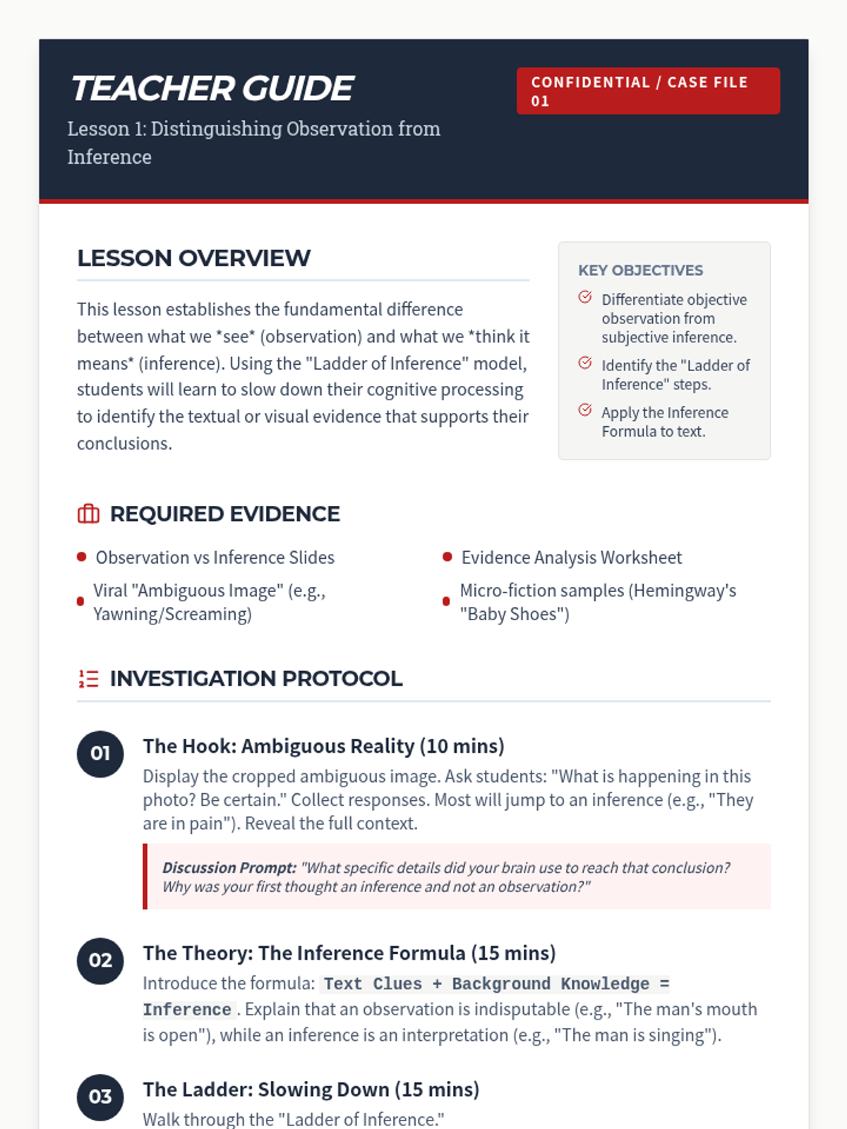 A high-engagement sequence for 11th-grade students that frames text analysis and inference-making as a forensic investigation. Students move from analyzing physical artifacts to evaluating unreliable narrators and complex rhetorical motives, culminating in a formal 'indictment' of a text's meaning.