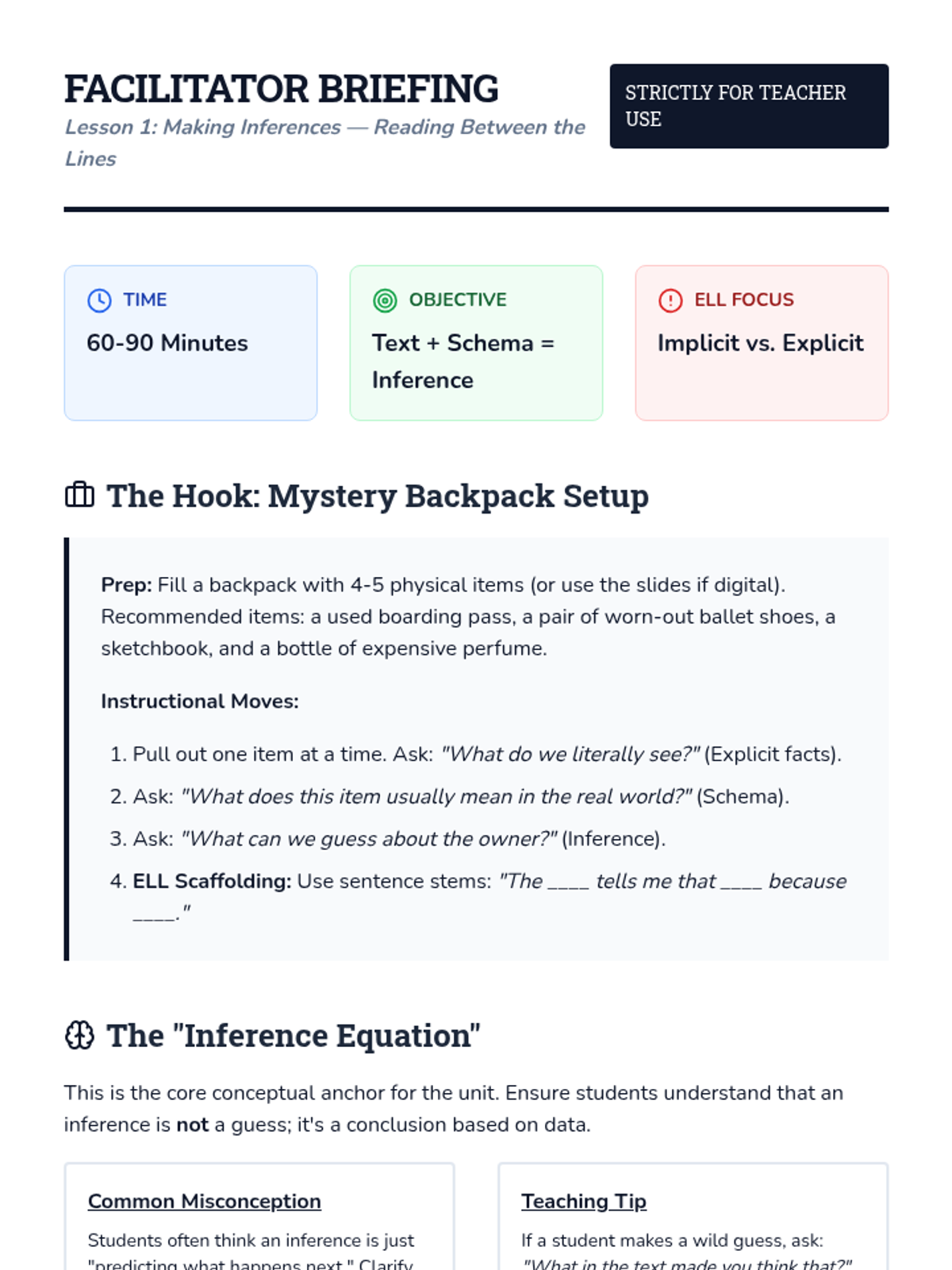 A 5-lesson sequence for 11th-grade ELL students focused on deep reading comprehension. Students will master inferencing, character motivation, plot structure, and theme identification through a 'Literary Detective' lens, culminating in student-led literature circles.