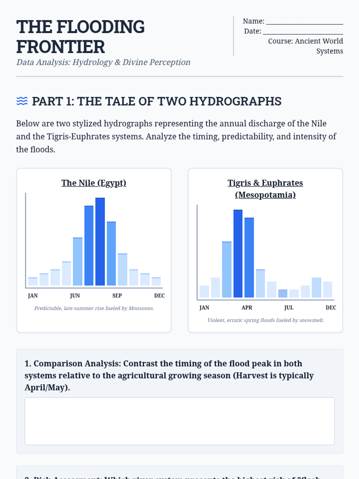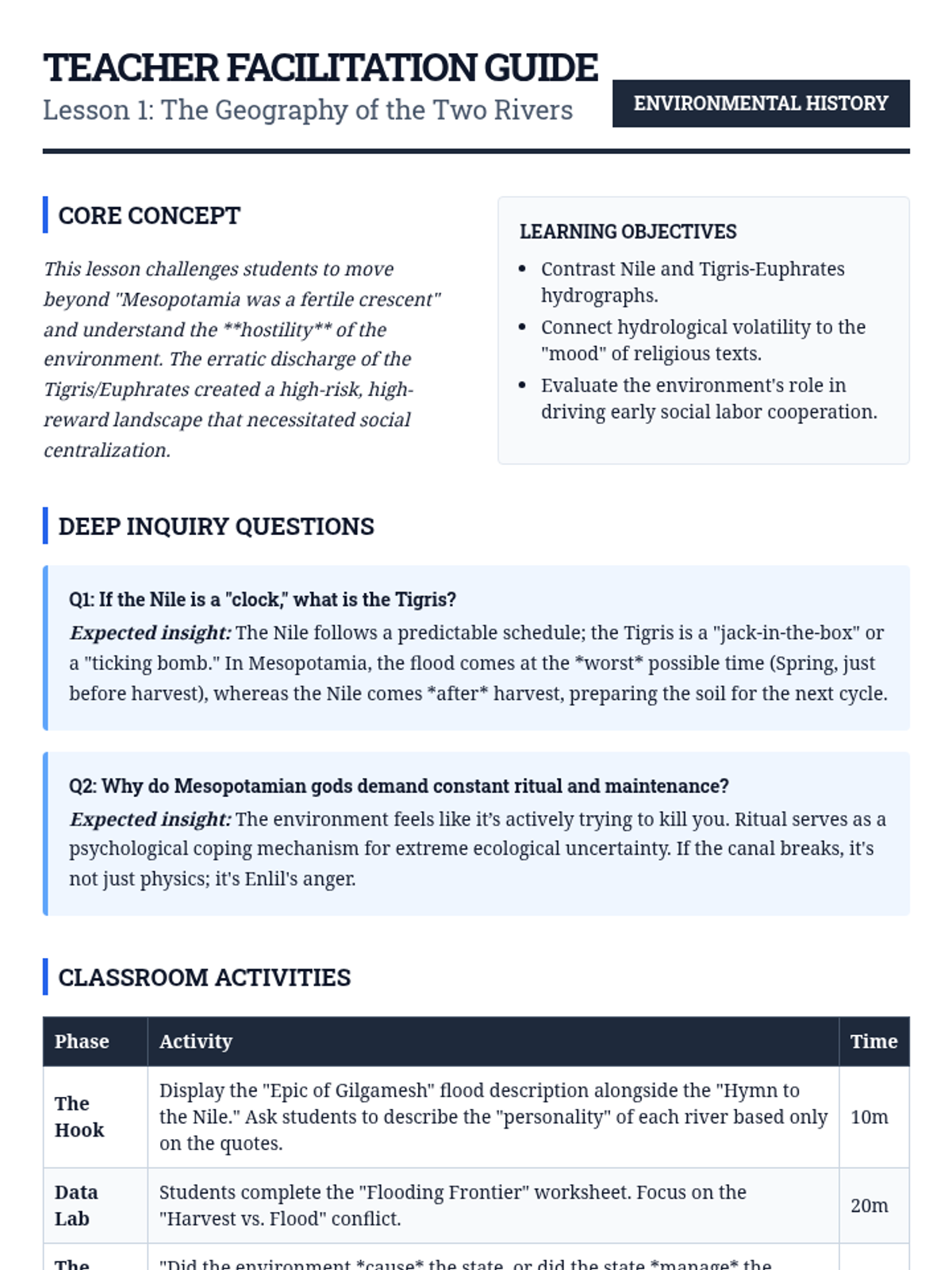 An environmental history sequence examining how the Tigris-Euphrates hydrology shaped Mesopotamian social structures, technology, and eventual ecological decline. Students will analyze the relationship between irrigation, political centralization, and ecological sustainability.