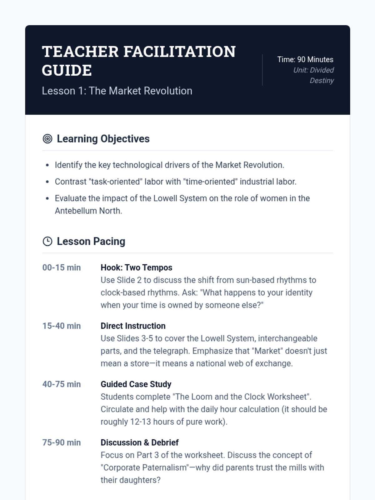 An 11th-grade US History sequence exploring the divergent economic and social paths of the North and South during the Antebellum period, leading to the structural foundations of the Civil War. Students analyze the Market Revolution, the rise of King Cotton, infrastructure developments, and Nativist reactions to immigration.