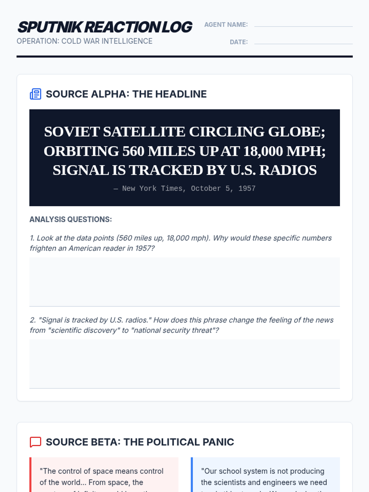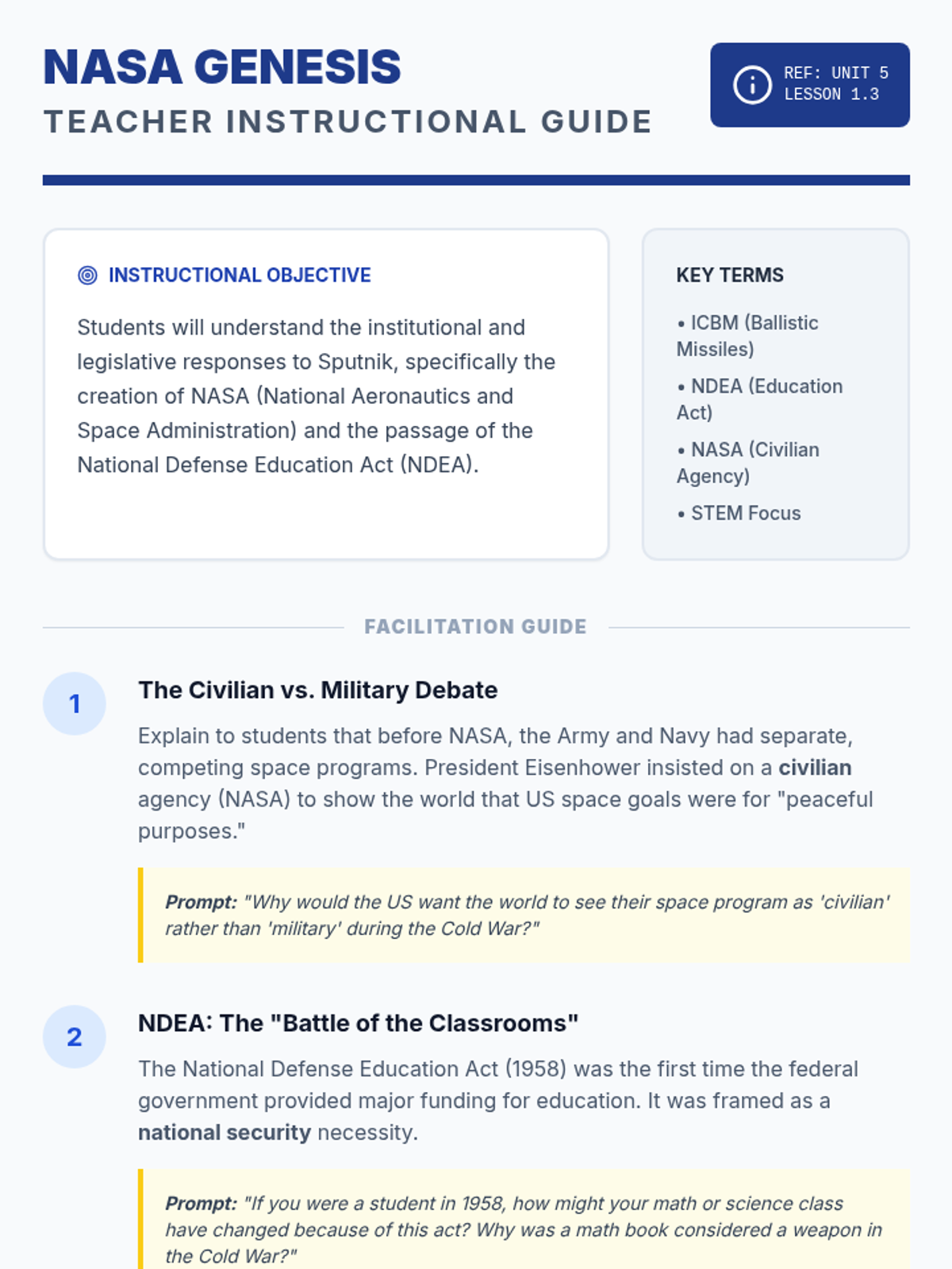 This sequence explores the Space Race as a critical front of the Cold War, examining how the rivalry between the USA and USSR drove technological advancement, shifted educational priorities, and eventually transitioned from fierce competition to international cooperation. Students analyze primary sources, rhetoric, and cultural impacts to understand the geopolitical stakes of the final frontier.