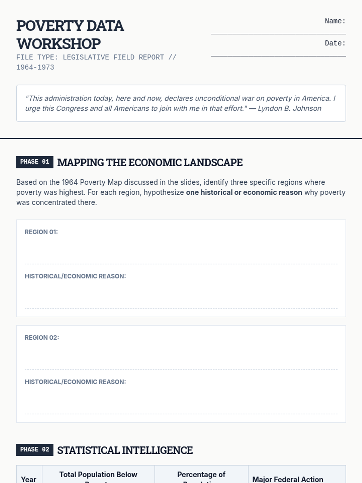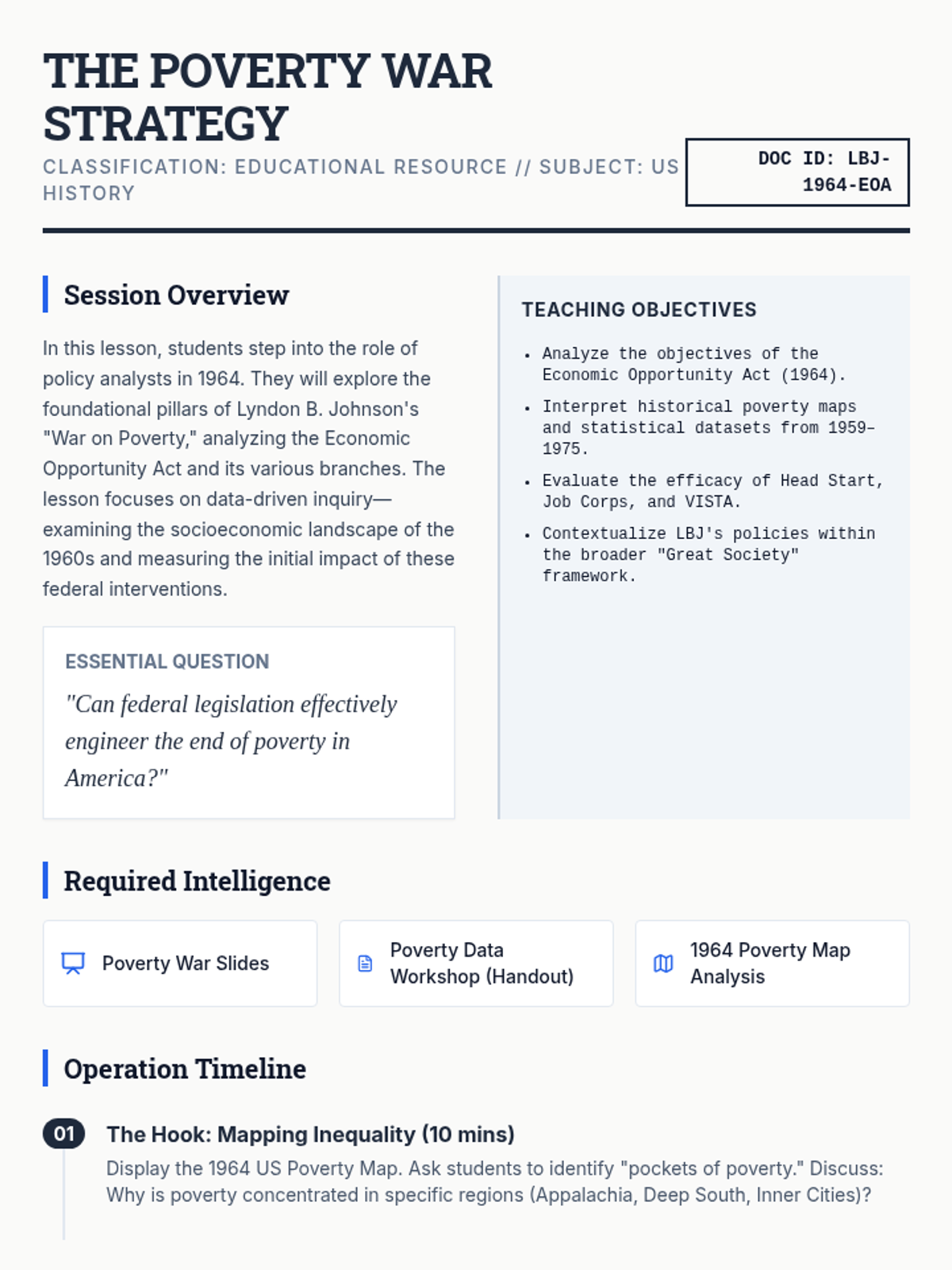 A high-school level investigation into the legislative achievements, economic trade-offs, and social impacts of Lyndon B. Johnson's 'Great Society' domestic agenda. Students analyze primary sources, simulate the legislative process, and evaluate the long-term legacy of the War on Poverty.
