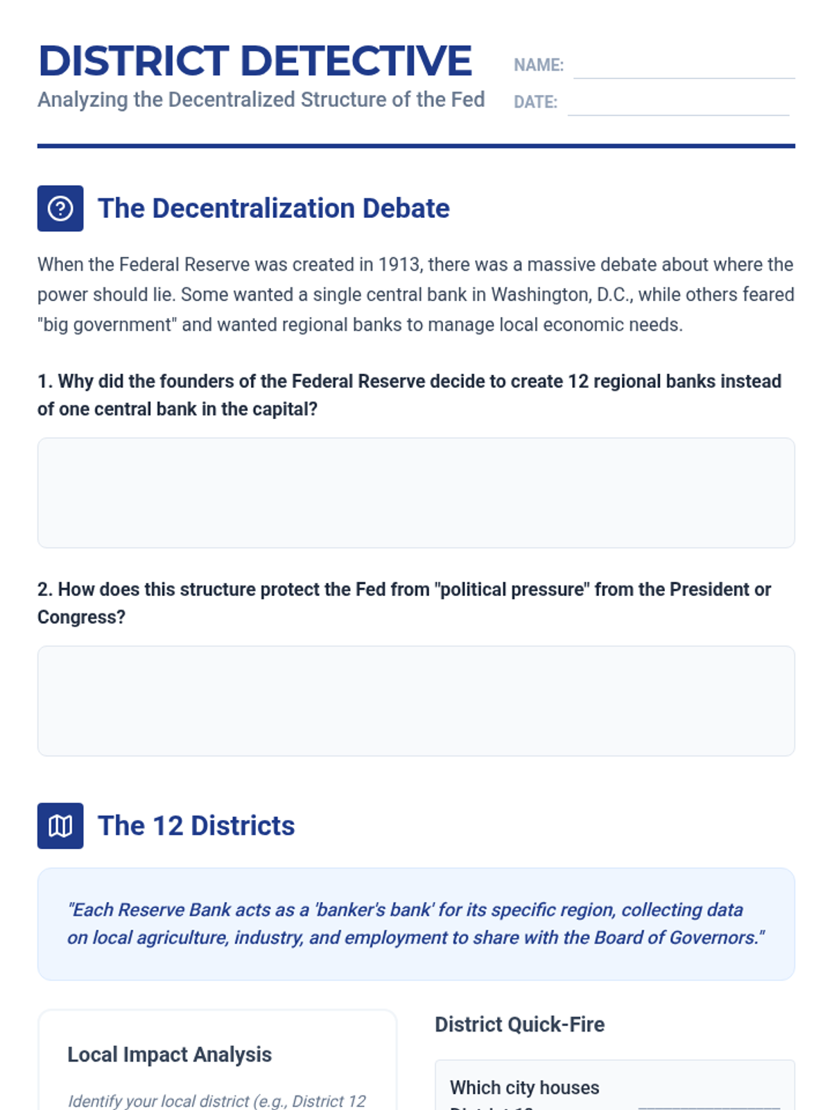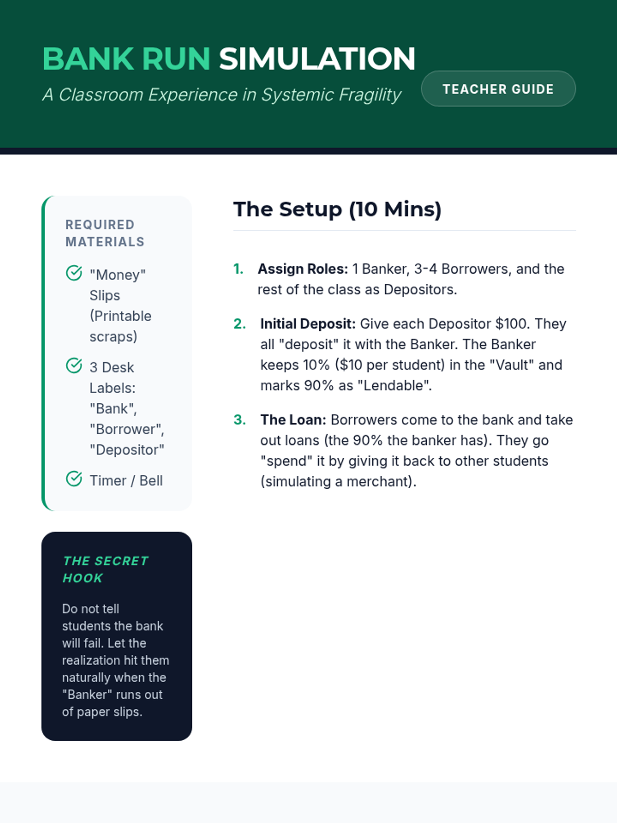 This sequence examines the stability of the banking system, focusing on regulations, crises, and the balance between free markets and government oversight. Students investigate the history of banking panics, the creation of the FDIC, and the causes of the 2008 Financial Crisis.