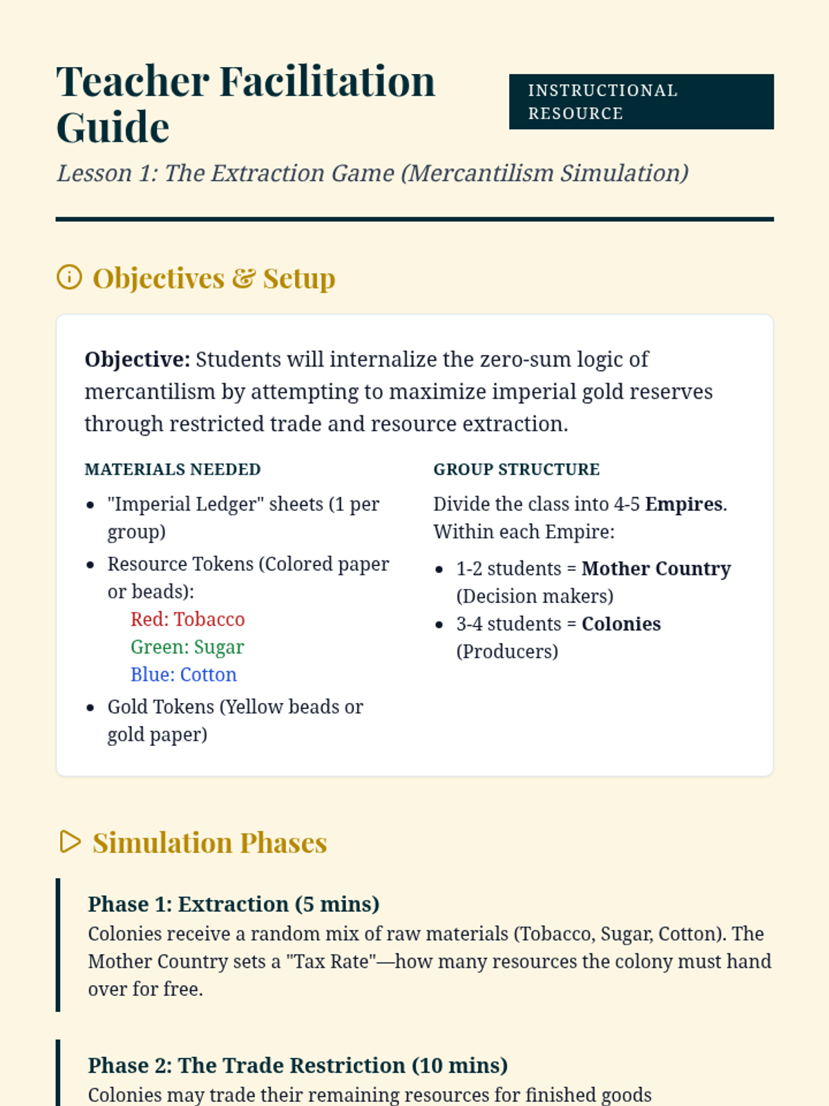 This sequence immerses students in the economic mechanisms that led to the Great Depression, focusing on speculation, market failure, banking panics, and global contraction. Students move beyond memorizing dates to analyzing systemic failures through simulations, primary source analysis, and causal mapping.