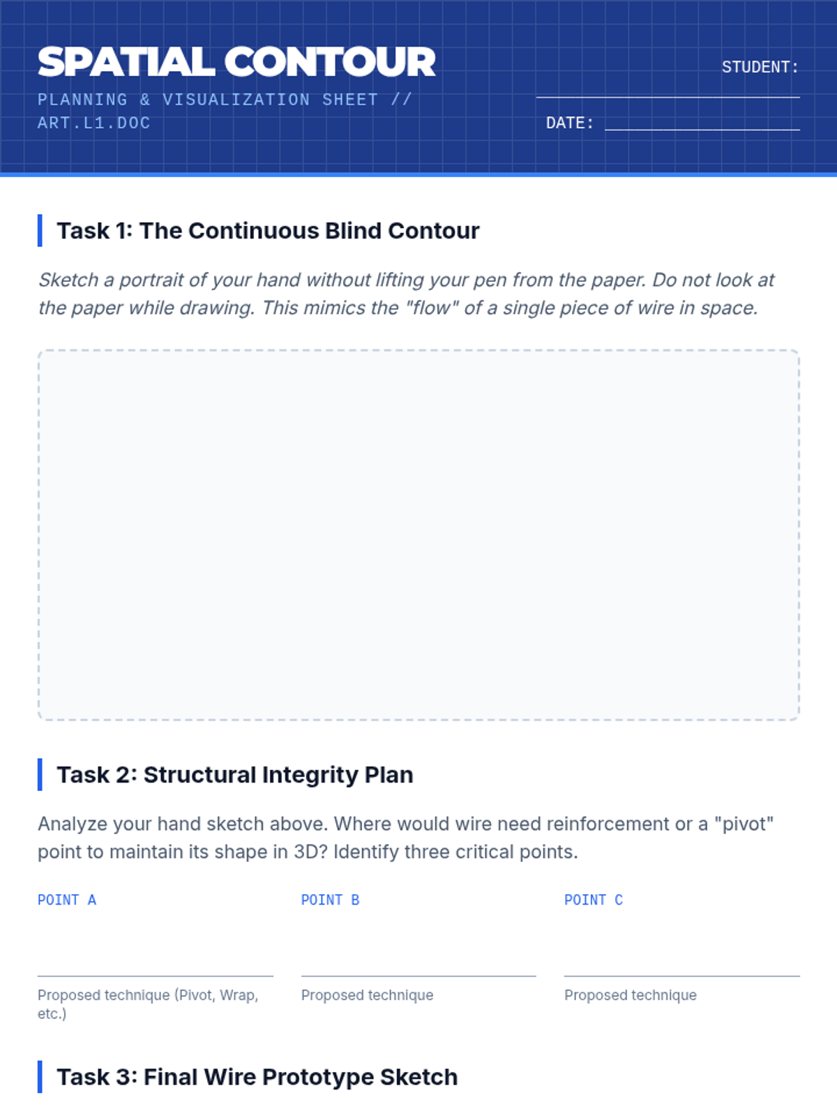 This sequence explores linear media (wire, rod, and tubing) to create 'drawings in space' that define volume without mass. Students learn to translate 2D contour drawings into 3D forms using cold-connection techniques, investigating implied volume, tension, and the interplay between light and shadow.