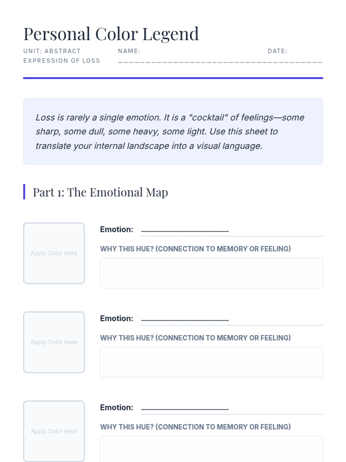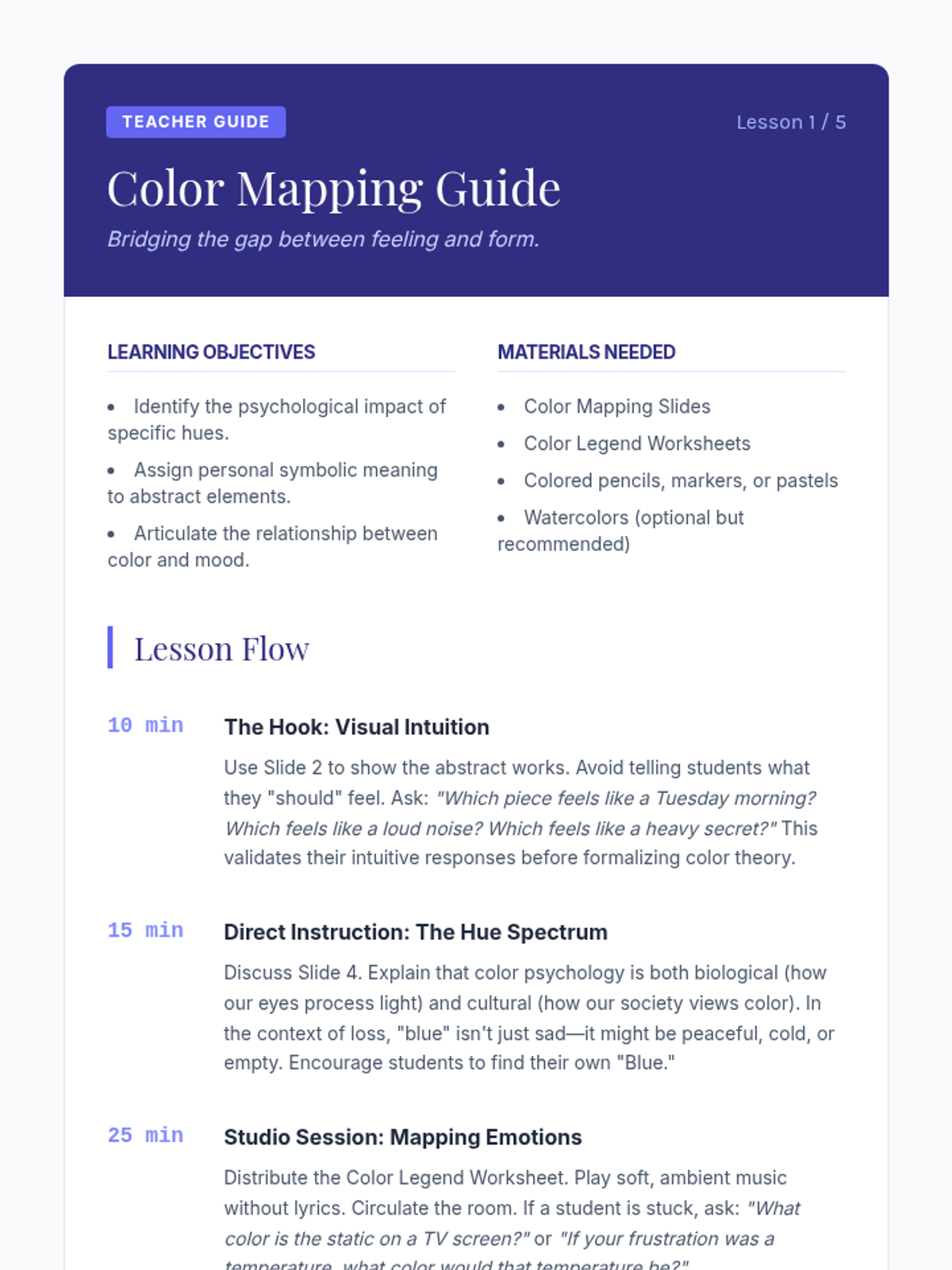 This sequence guides students through using visual arts as a non-verbal language for processing complex emotions associated with loss, focusing on abstract expressionism and color theory.