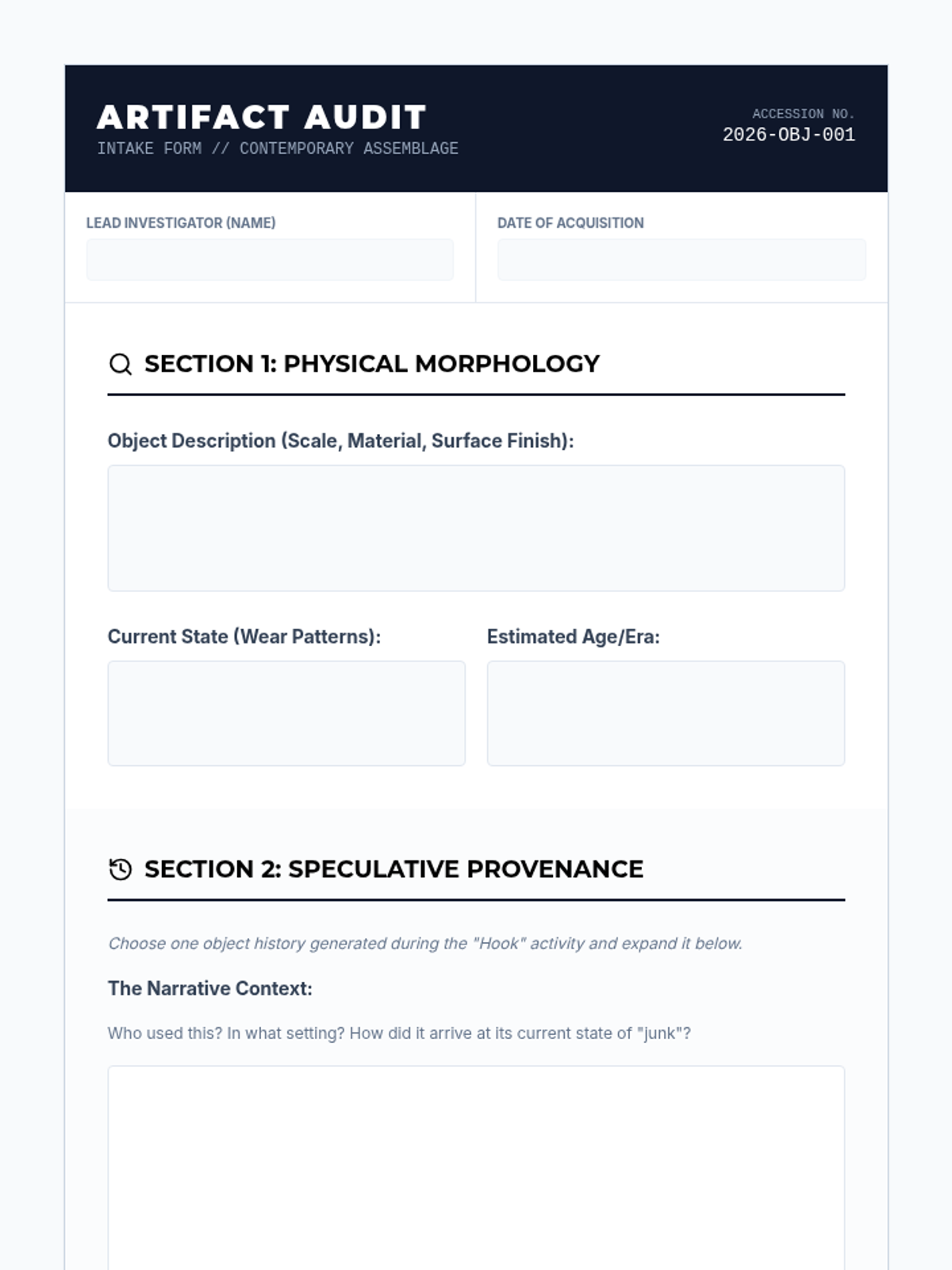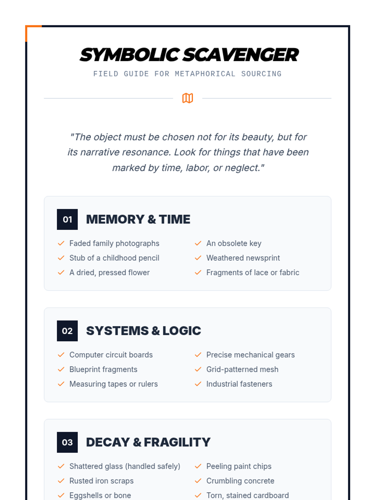 A high-level sculpture sequence for 12th-grade students focusing on the conceptual and technical aspects of contemporary assemblage. Students transition from found objects to semiotic narratives, mastering cold joinery techniques and installation logic.