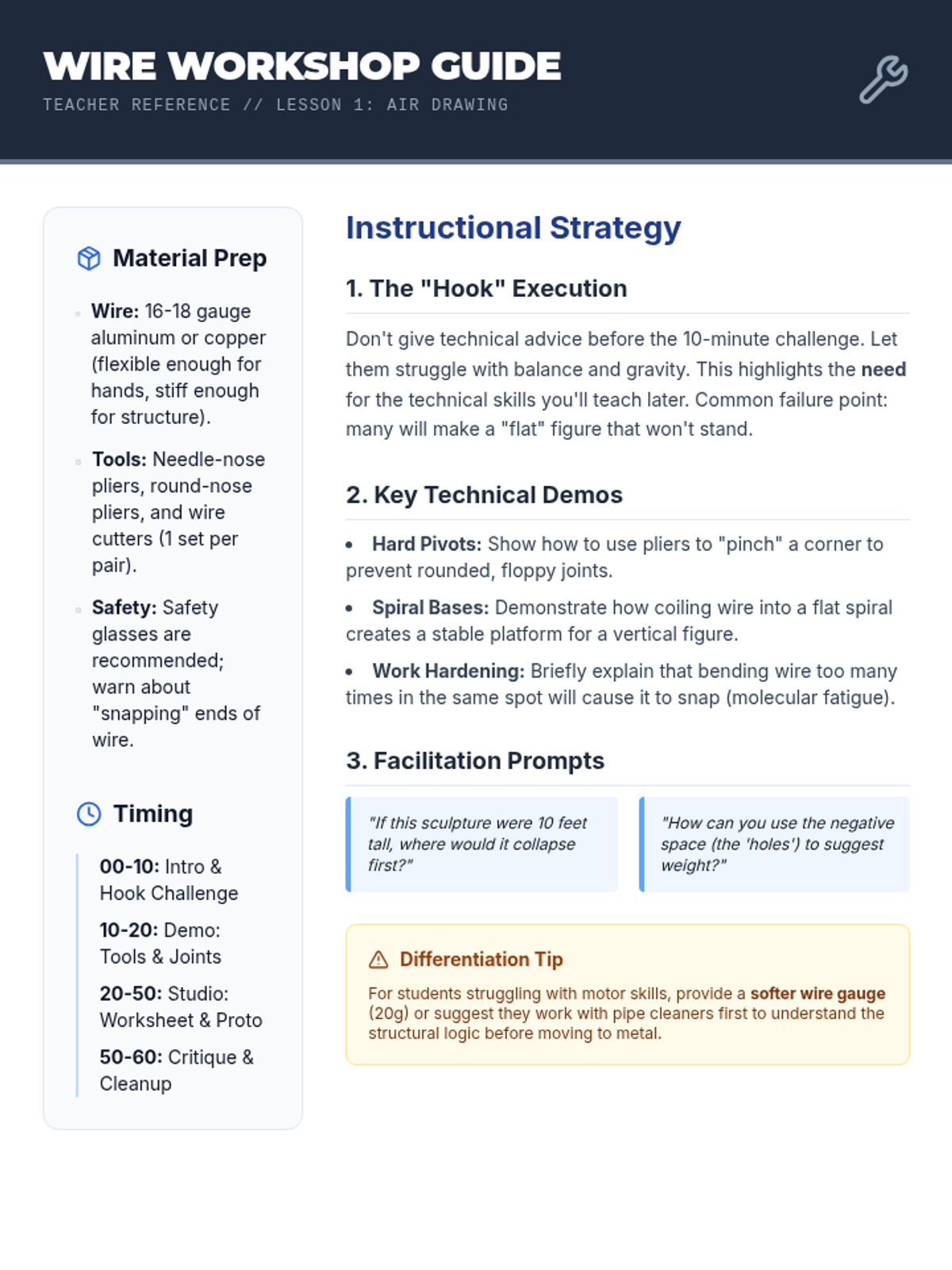 This sequence explores the intersection of engineering and art through the creation of kinetic wire sculptures. Students progress from basic wire manipulation to complex mobile construction, culminating in a lighting installation that showcases movement and shadow.