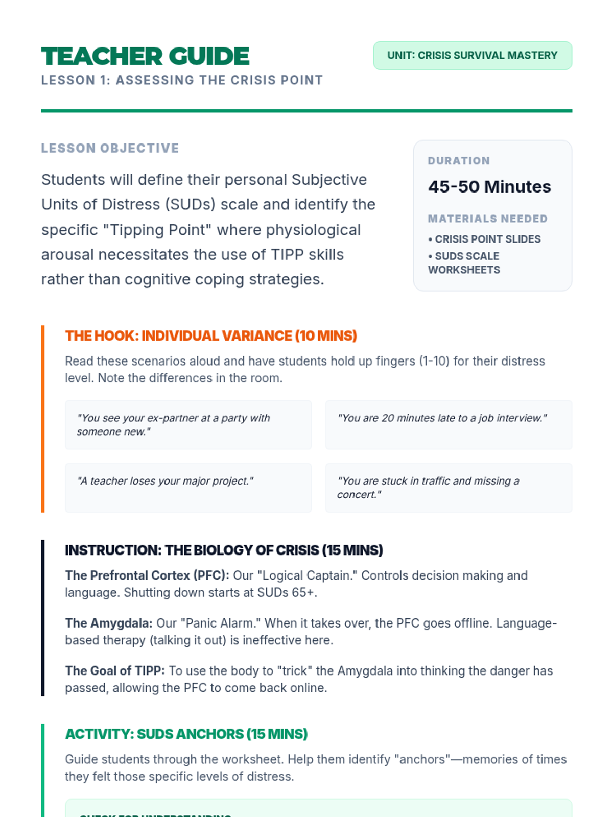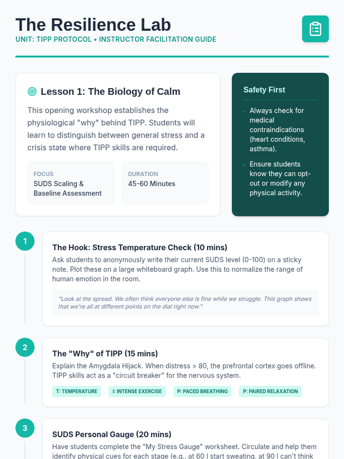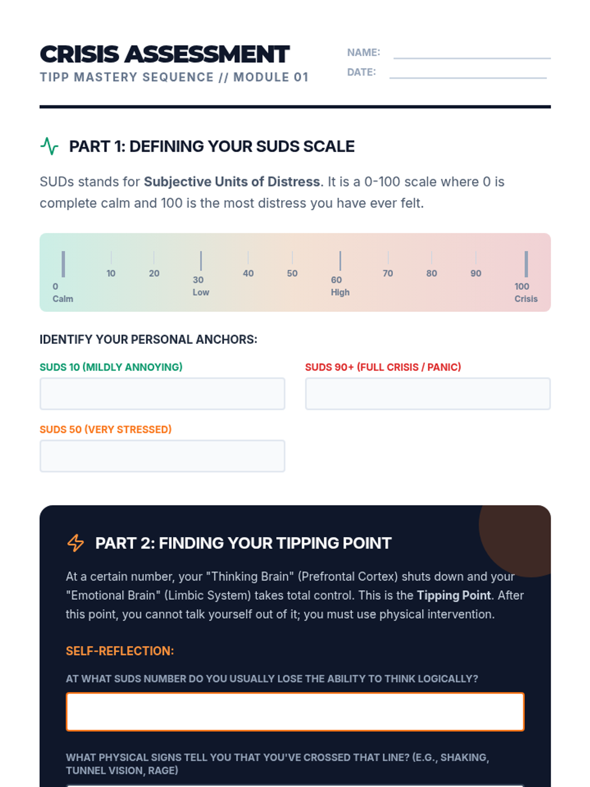Identifies mental health crises and suicide warning signs while developing personal safety plans and grounding techniques. Equips users with peer gatekeeper skills and direct pathways to professional crisis resources and hotlines.