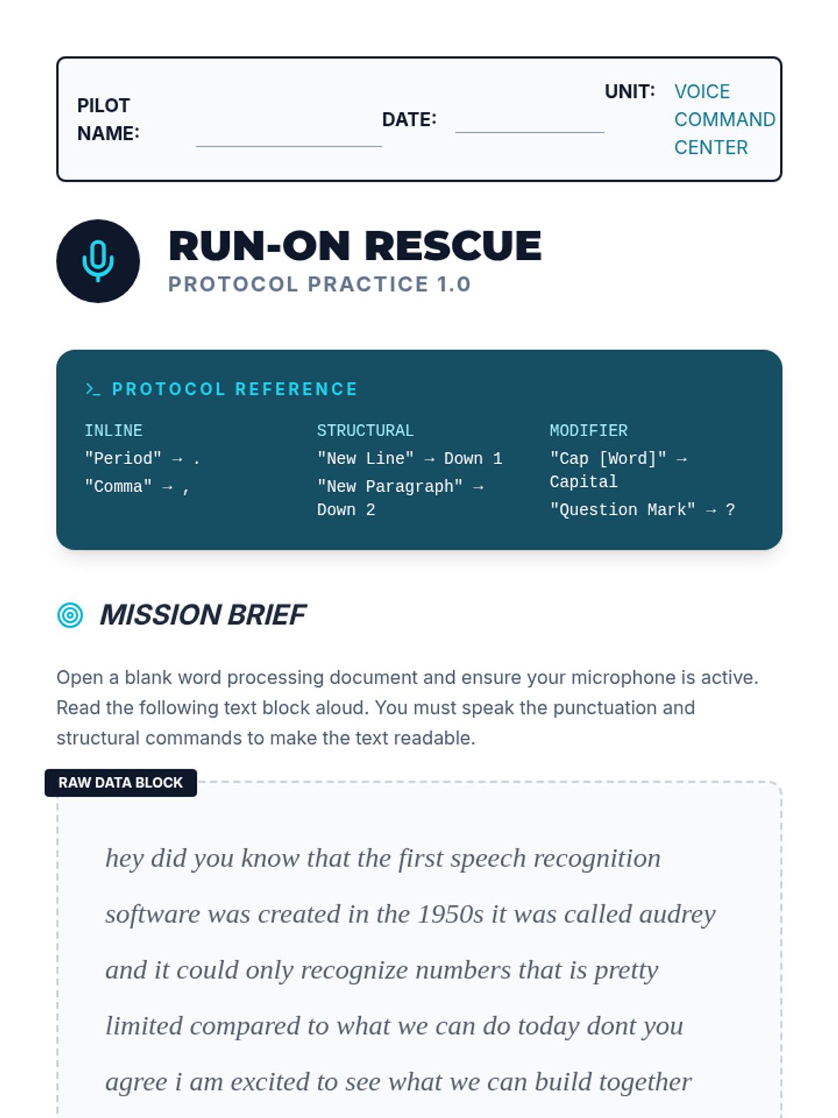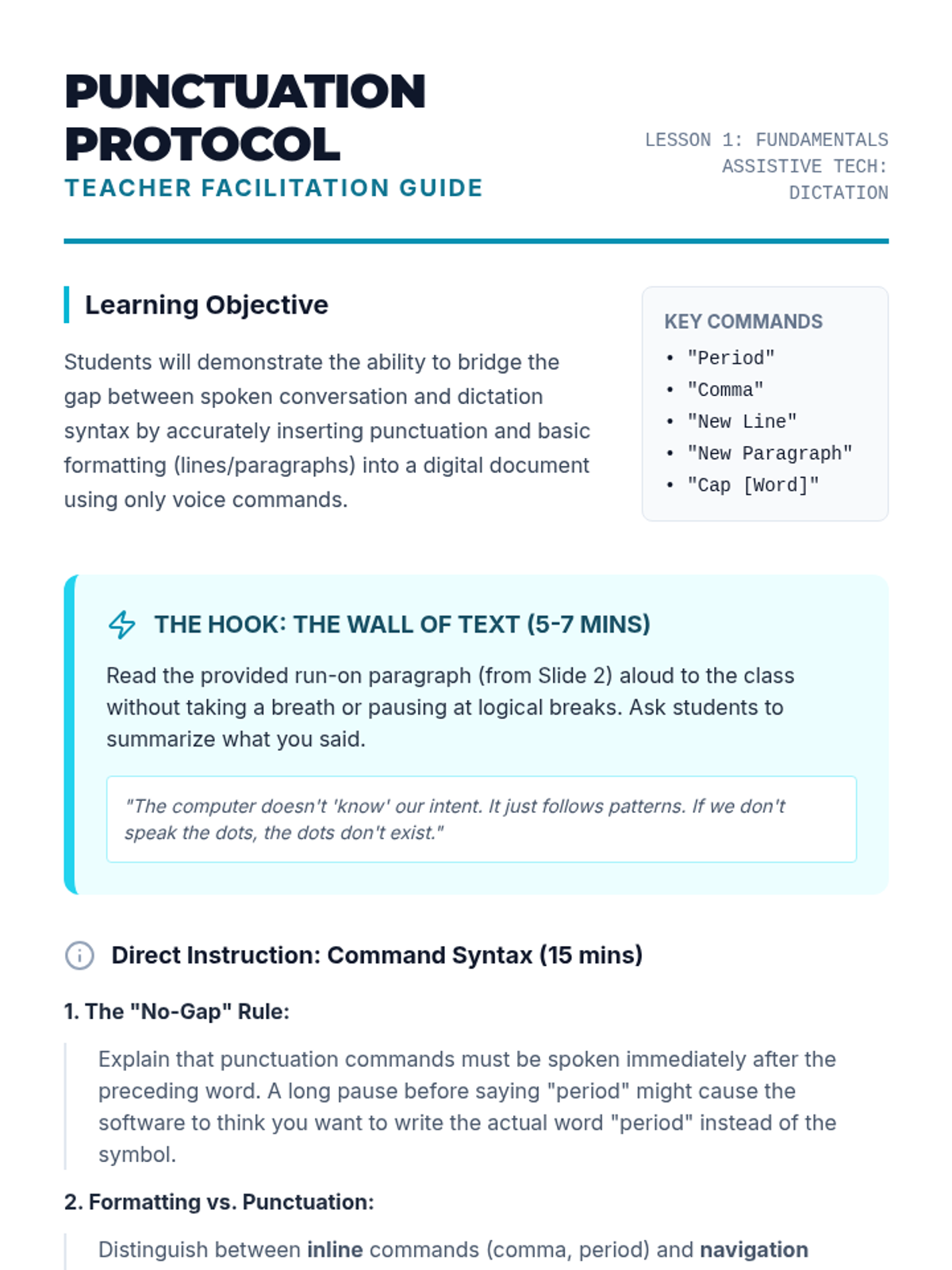 A comprehensive sequence for 11th-grade students to master speech-to-text technology, focusing on voice commands, punctuation syntax, and hands-free document formatting. Students transition from basic dictation to precise cursor control and layout management.