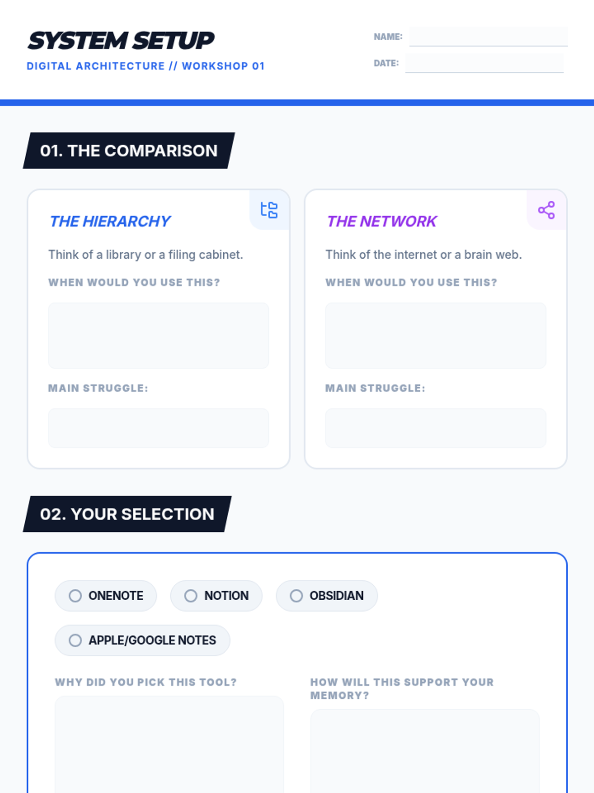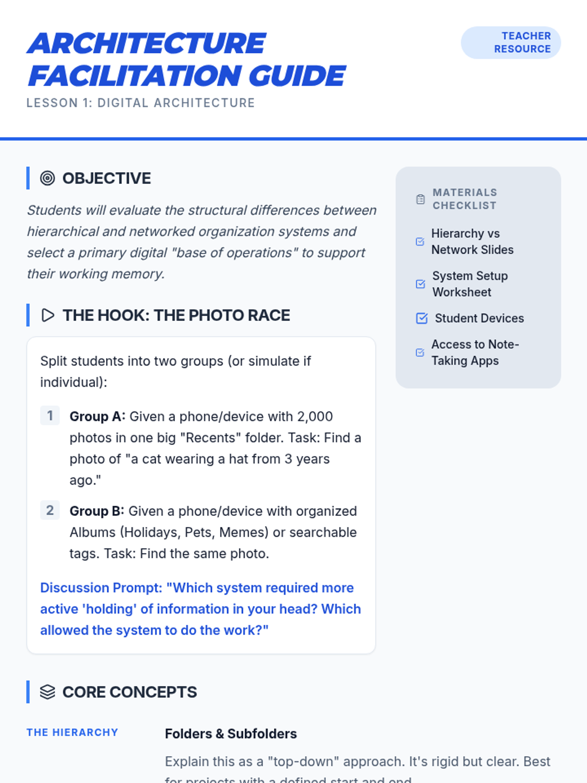 A specialized sequence for 12th graders to master digital organization, offloading working memory onto external systems through hierarchy, tagging, and synthesis. Students build a 'digital brain' to manage complex information for college and career readiness.