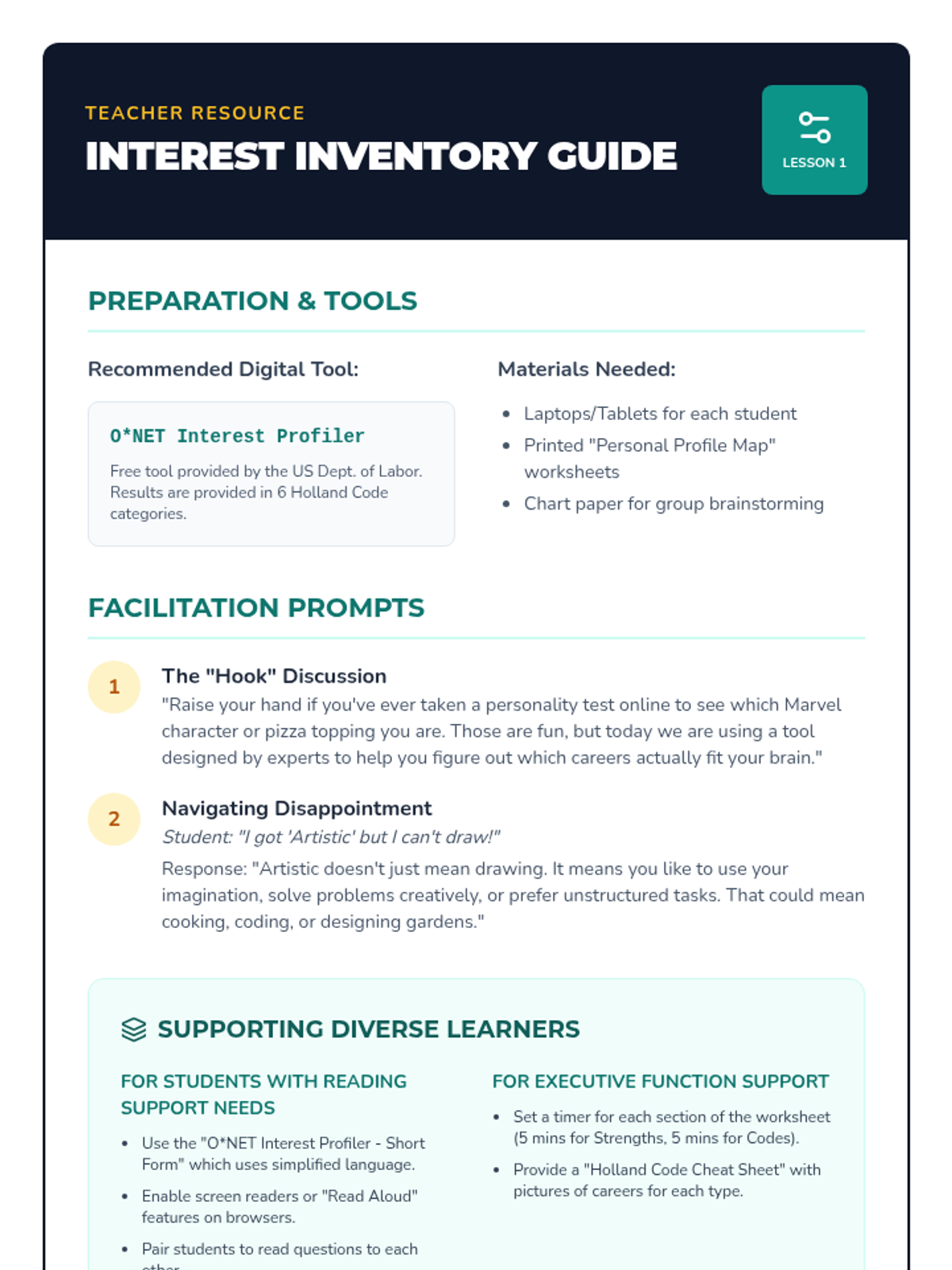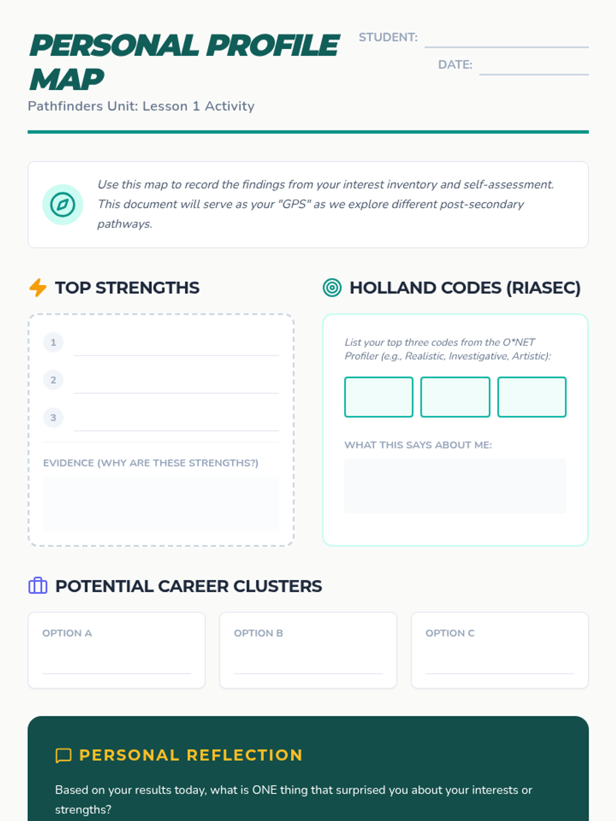 A comprehensive 9th-grade transition planning unit that guides students through self-assessment and the investigation of higher education, vocational training, and direct workforce entry pathways. Students align their personal strengths with future opportunities to create a viable post-secondary roadmap.