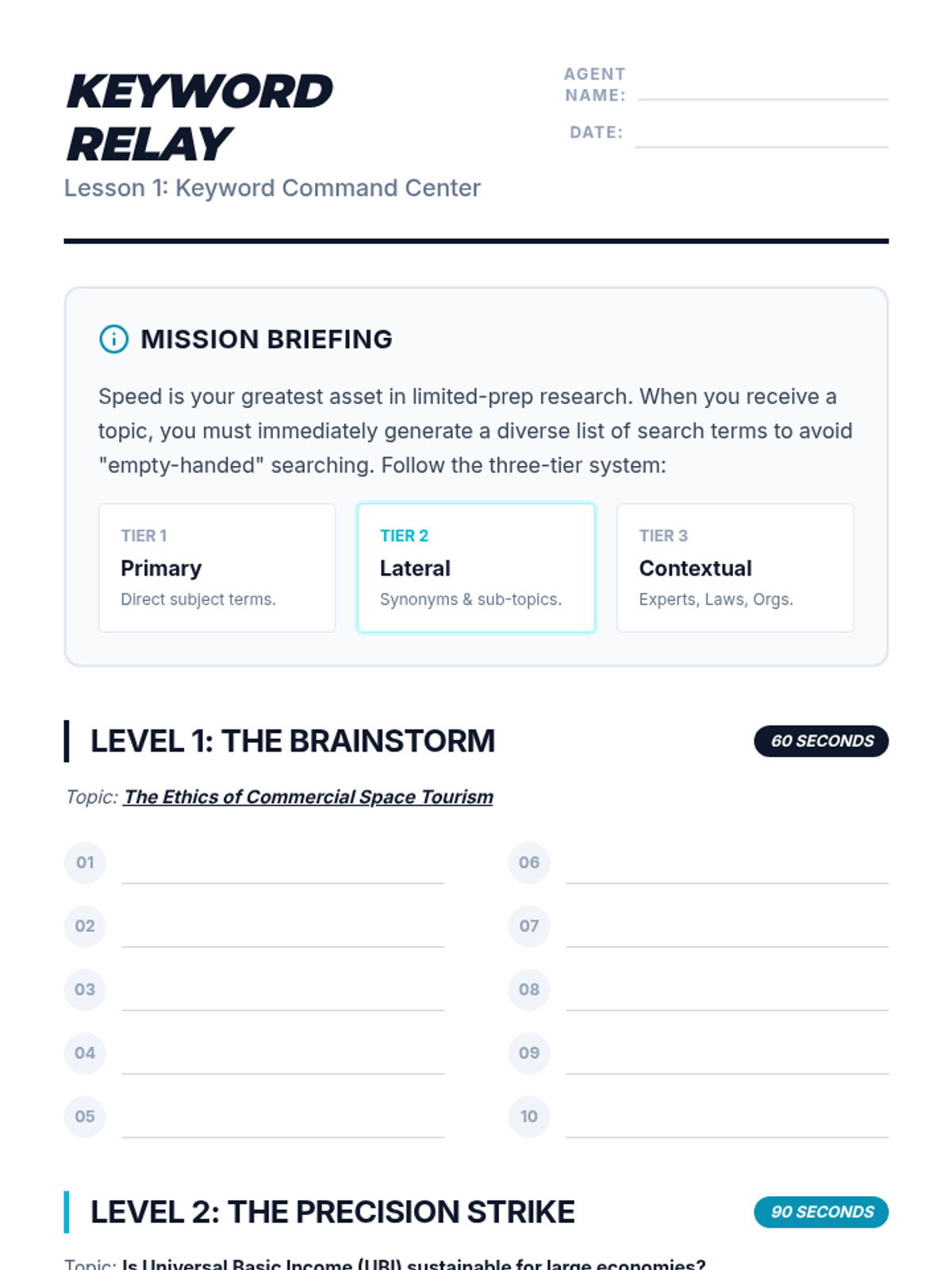 A game-based sequence for 9th-grade students to master rapid keyword generation, skimming techniques, information extraction, and oral citation fluency under time-pressure environments like Extemporaneous Speaking.