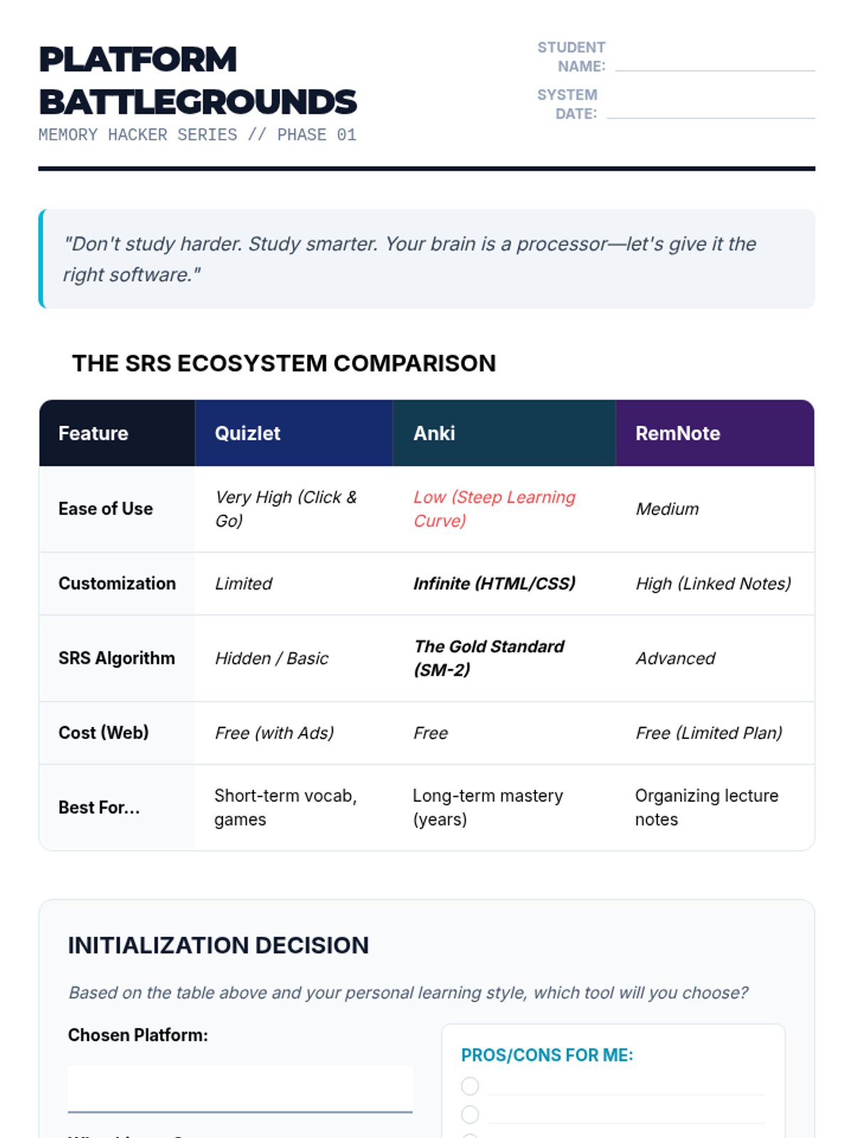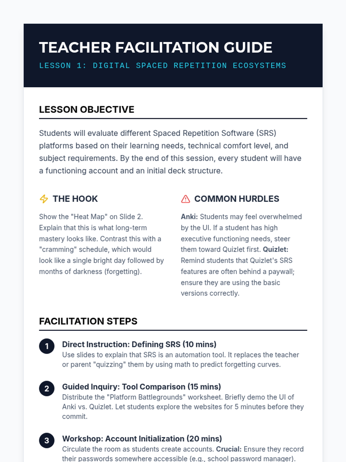 This sequence transitions 12th-grade students from manual study methods to digital spaced repetition software (SRS). Students will master advanced card-creation techniques, interpret retention data to optimize their learning, and develop long-term maintenance strategies for post-secondary success.
