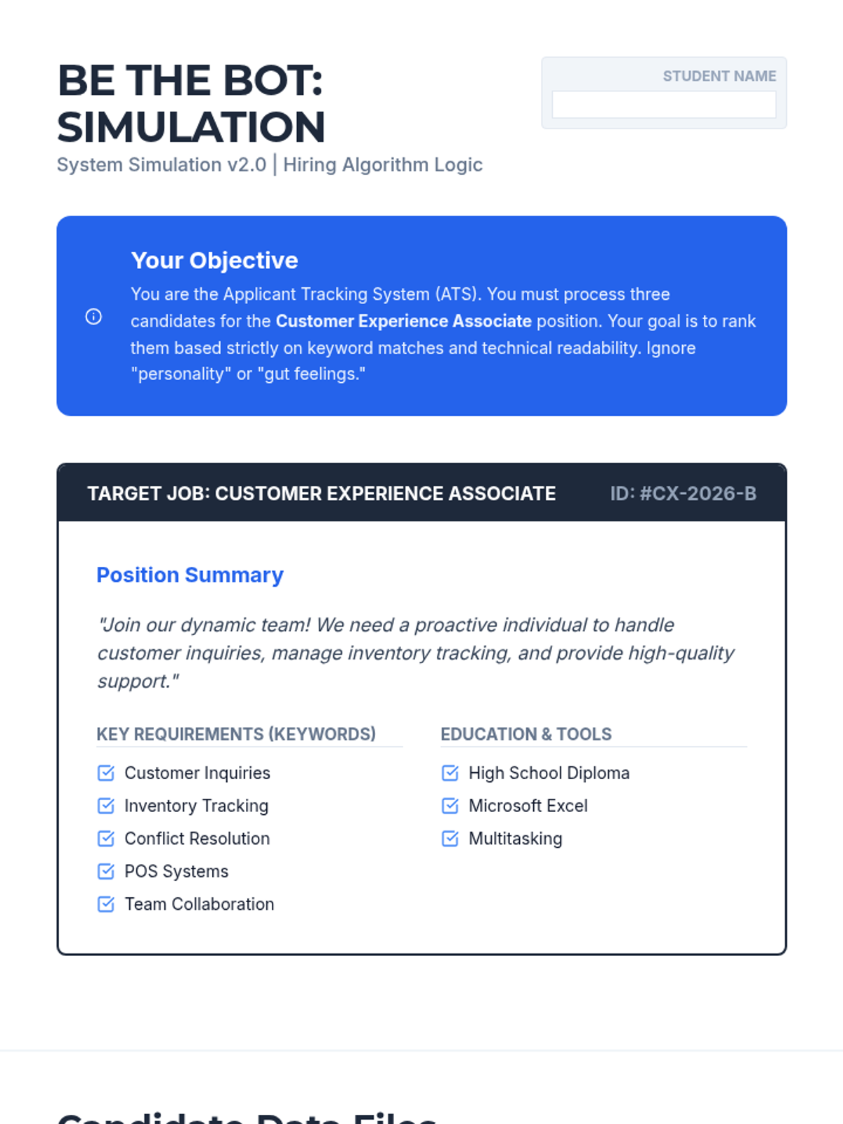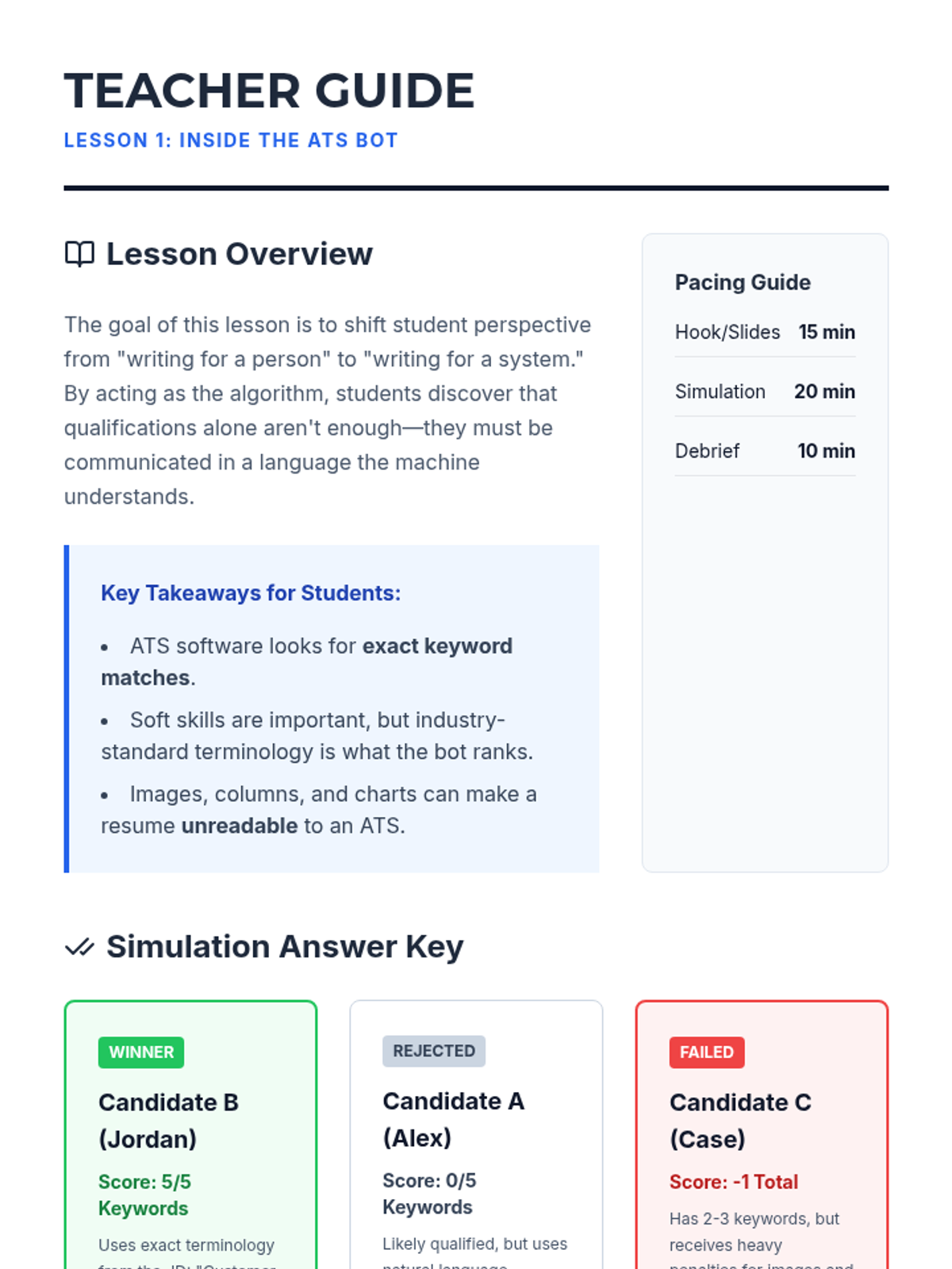 A comprehensive 5-lesson sequence for 12th-grade students on the strategic art of tailoring resumes. Students learn about ATS algorithms, decode job descriptions, translate youth experiences into professional keywords, and culminate in a project where they adapt a single resume for two distinct career paths.