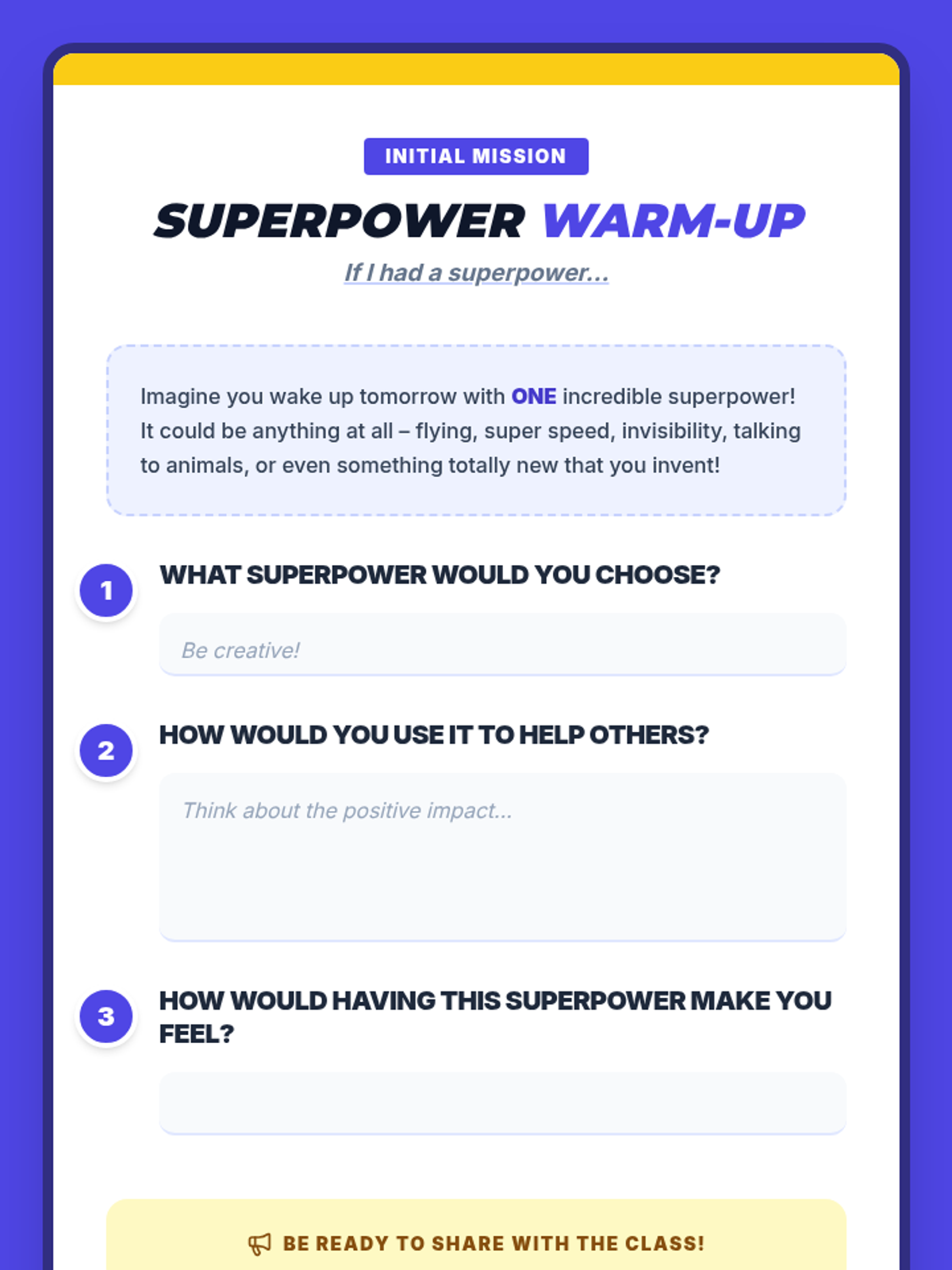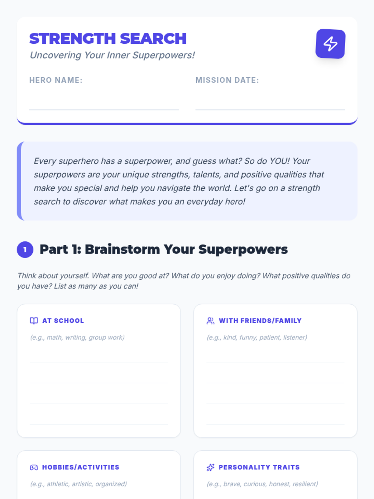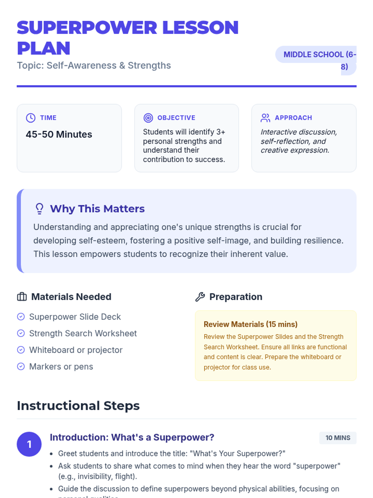 This sequence guides students from self-discovery to professional application. It begins by helping middle schoolers identify their unique 'superpowers' (strengths) and transitions into practical skills for adult learners or older students ready for their first job application.