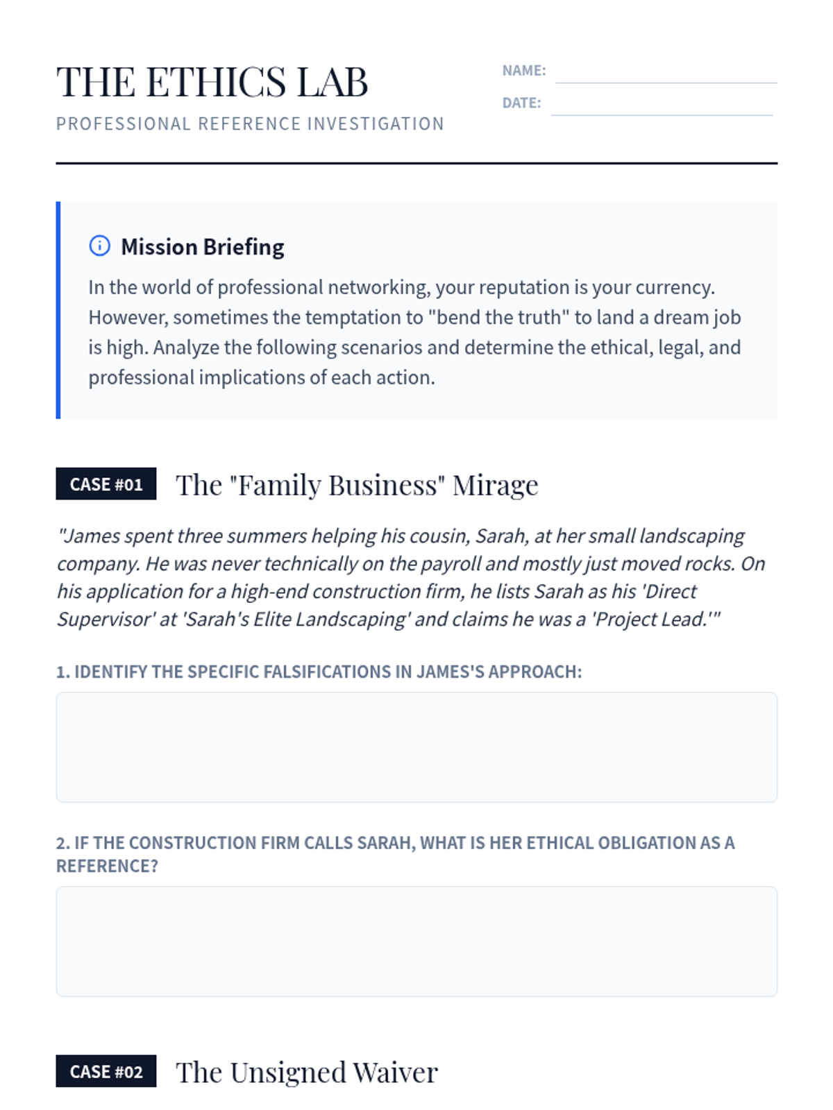 An inquiry-based unit where students act as hiring managers to understand the strategic power of professional references in the job market. Students move from decoding reference forms to strategically selecting references and managing professional reputations.