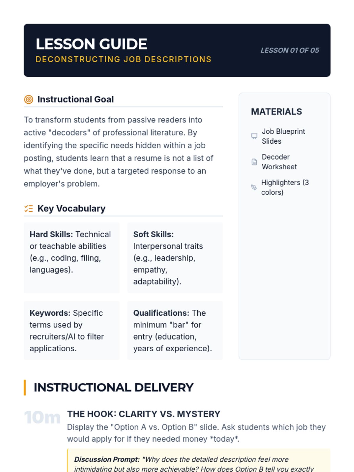 This sequence guides students through deconstructing job postings to create aligned resume content. Students learn to identify requirements, translate personal experiences into professional language, and draft high-impact bullet points, culminating in a tailored resume for a specific role.