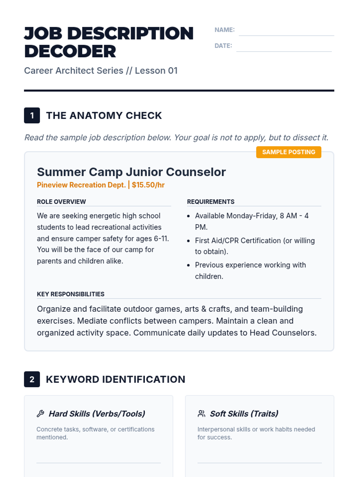 This sequence equips students with the analytical tools to decode complex job postings and accurately identify employer needs. Students learn to navigate the structure of advertisements, distinguish between essential and preferred qualifications, decode industry jargon, and perform personal gap analyses to prepare for their future careers.
