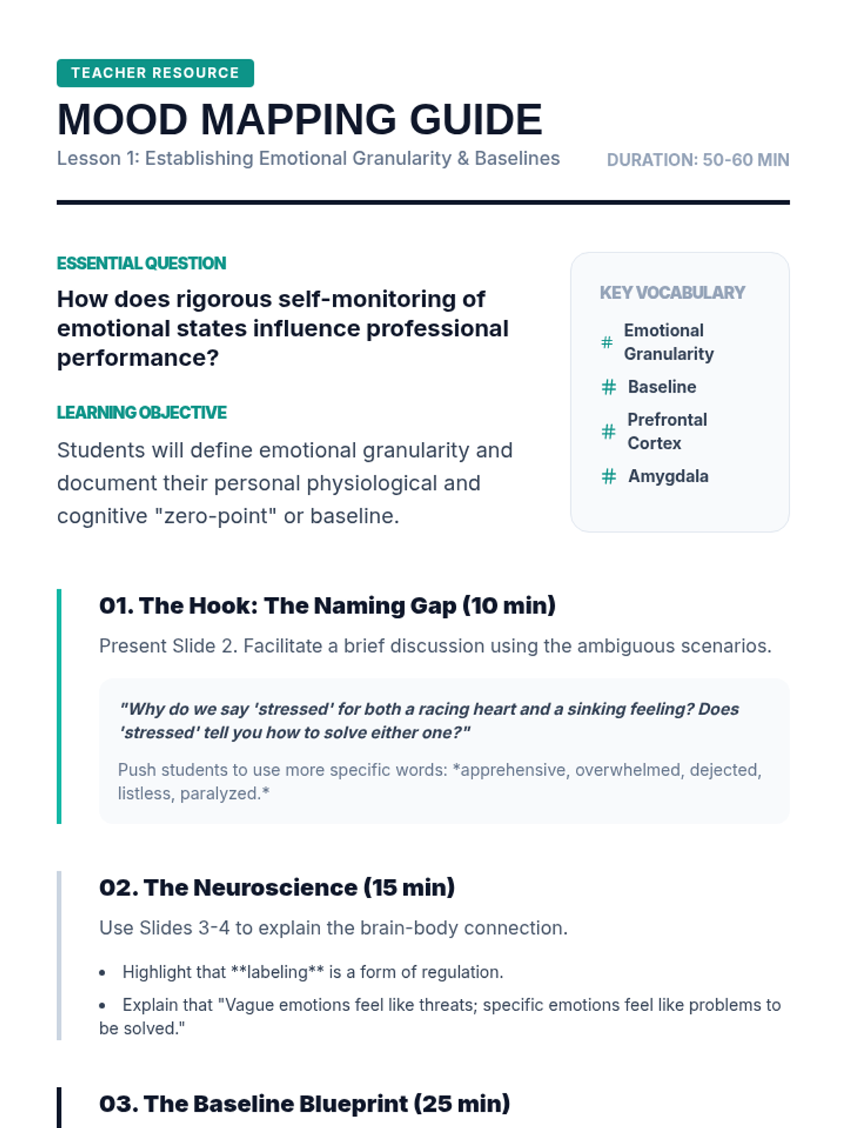 This sequence transitions 12th-grade students from teacher-led monitoring to autonomous self-regulation. It covers emotional granularity, energy management, professional communication, and recovery strategies, culminating in the creation of a personalized daily performance dashboard.