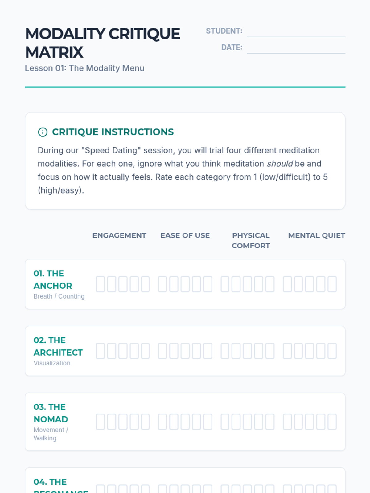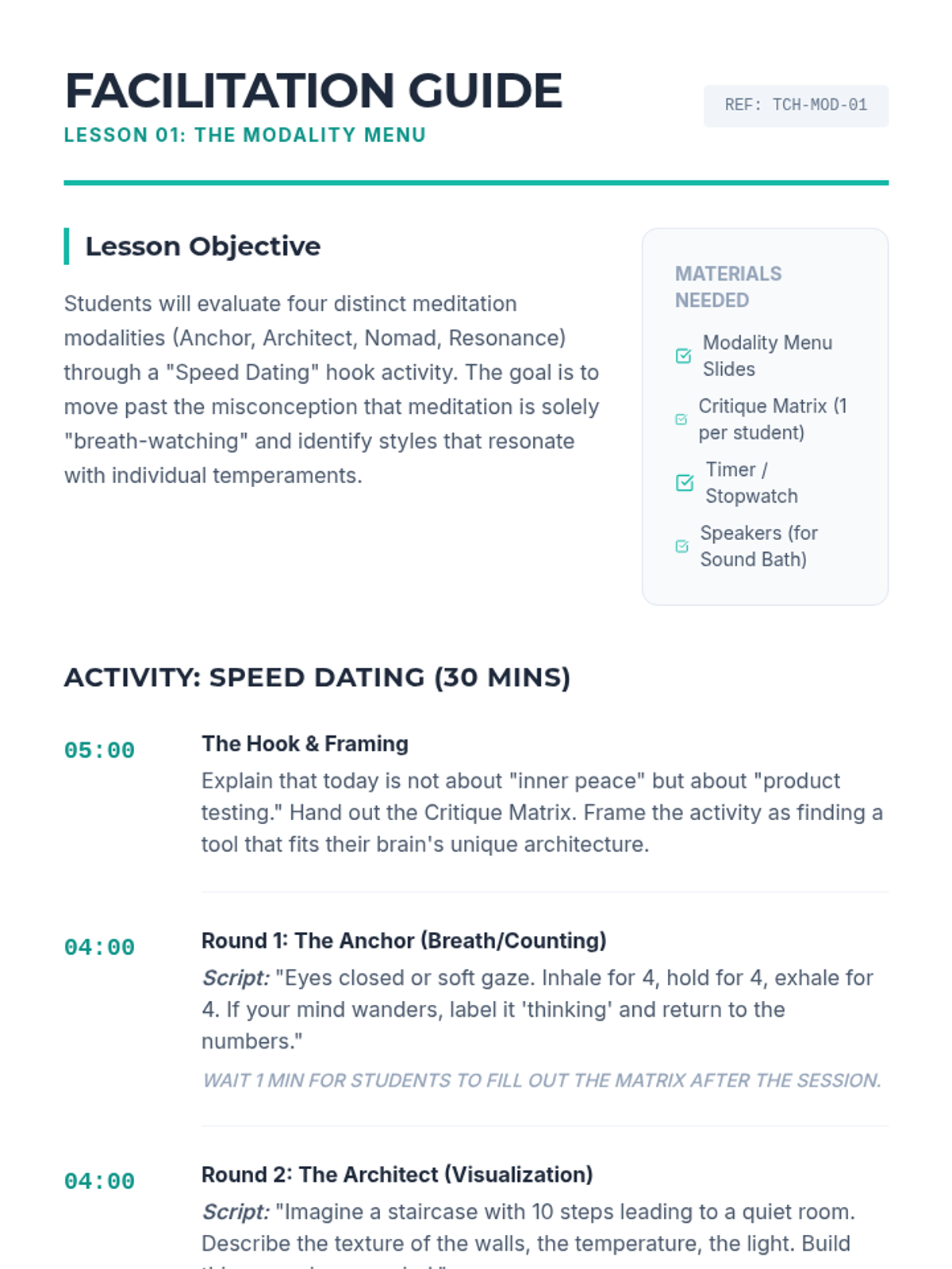 A mastery-based sequence for 12th graders focused on designing and sustaining a personalized meditation practice. Students explore modalities, apply habit science, and develop a 30-day post-graduation wellness plan.