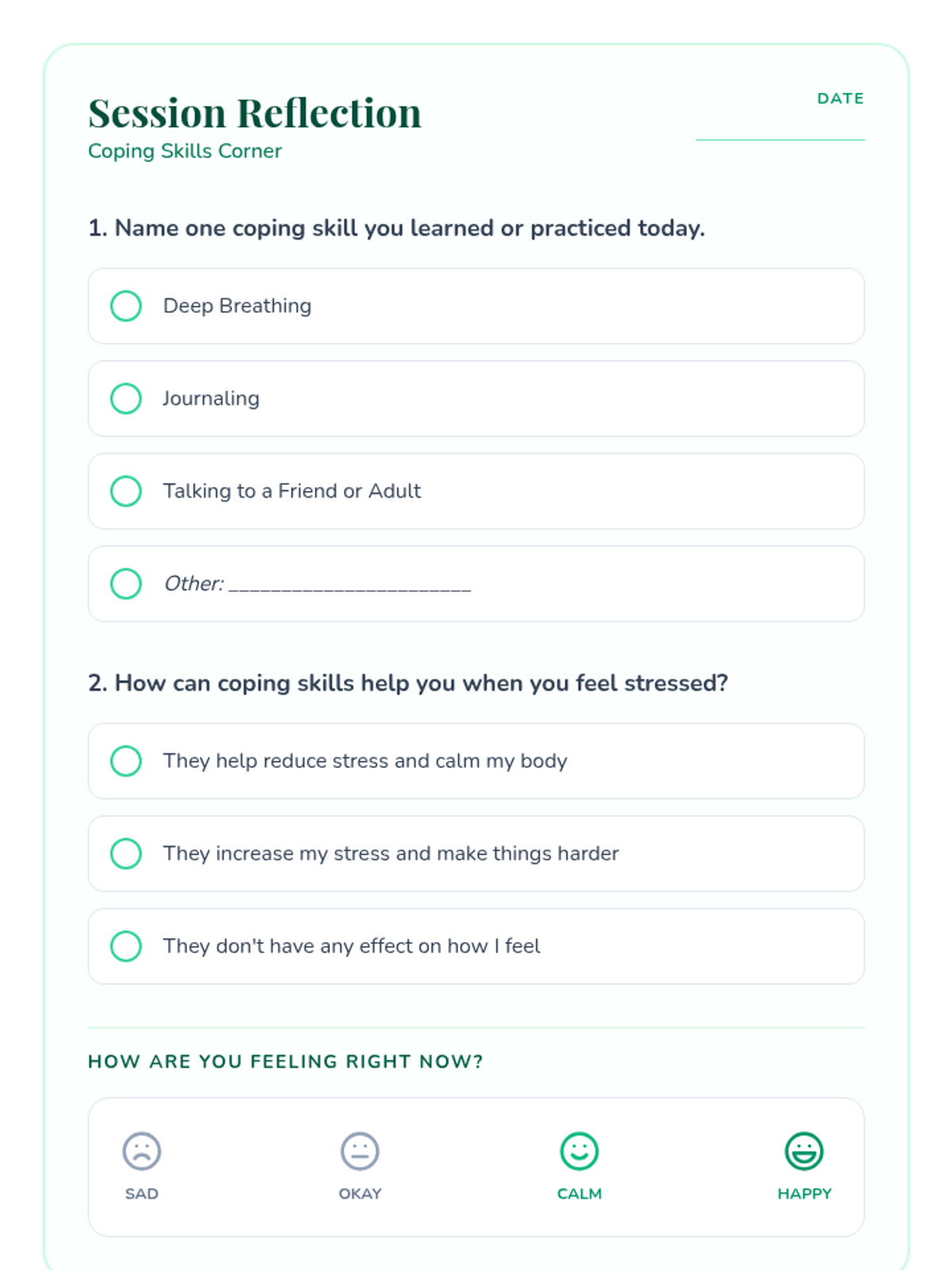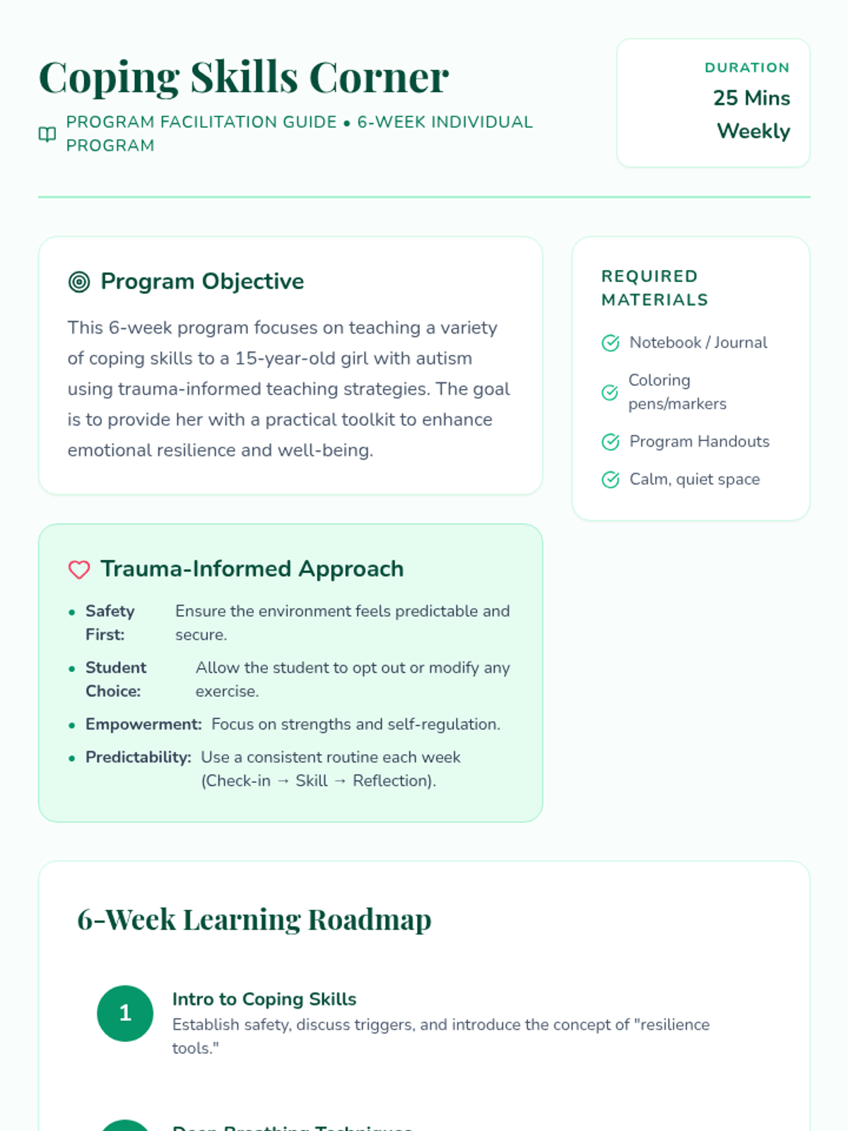 A comprehensive 6-week individual program designed to teach emotional regulation and stress management to a 15-year-old girl with autism using trauma-informed strategies. Each session introduces a unique coping skill, from deep breathing to journaling and physical movement.