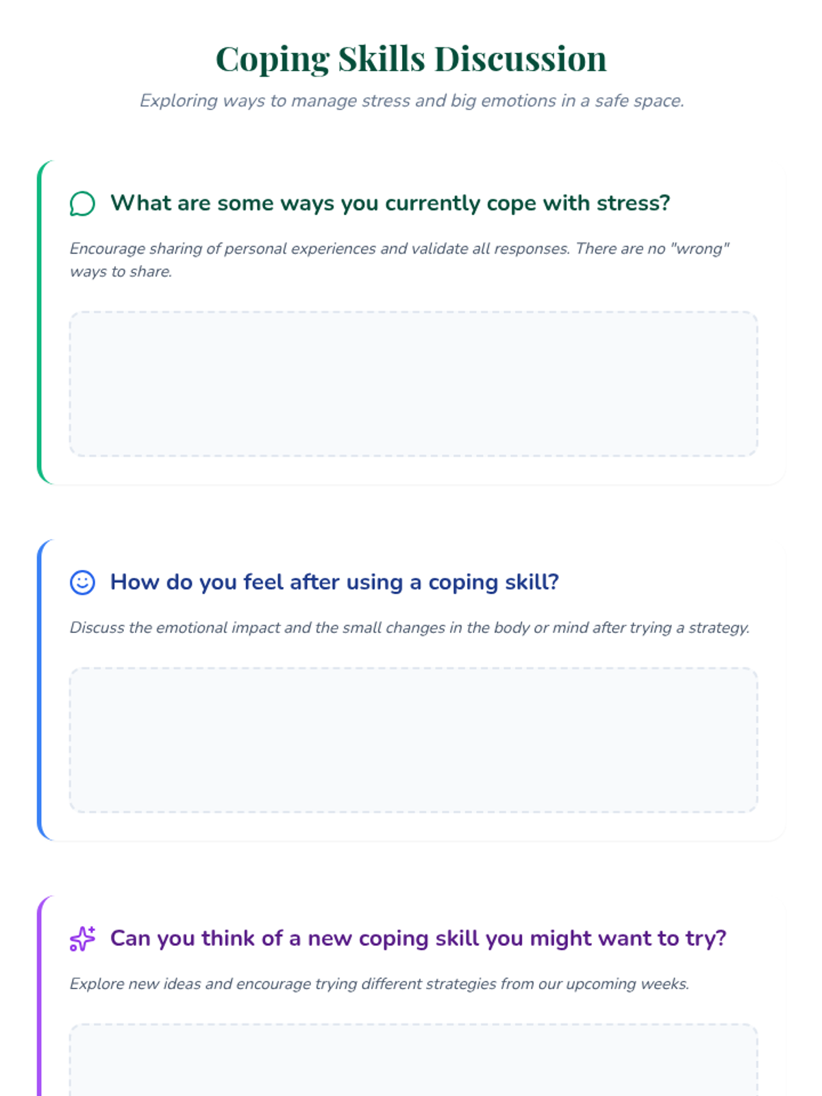A six-session individual support plan for a 16-year-old student to understand anger, learn psychoeducation about emotions, and practice effective coping skills. This Tier 3 plan combines guided discussions, targeted activities, and worksheets to build self-awareness and regulation.