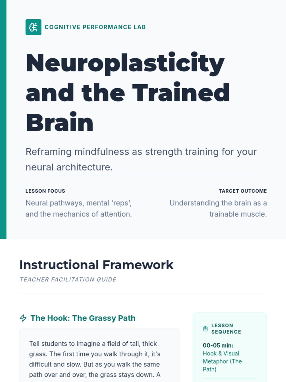 A sequence for 12th-grade students that reframes mindfulness as cognitive training to enhance focus, learning, and distraction management. It covers neuroplasticity, the inefficiency of multitasking, focused attention, open monitoring, and applying these skills to academic performance.