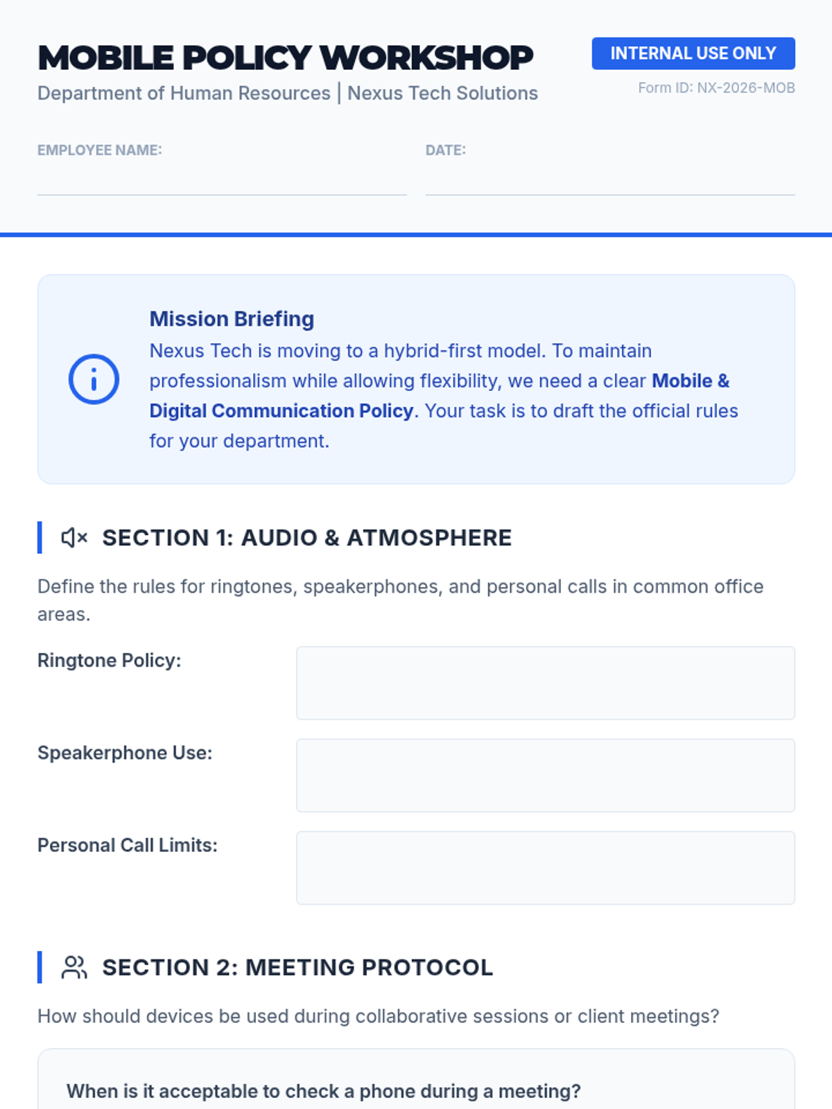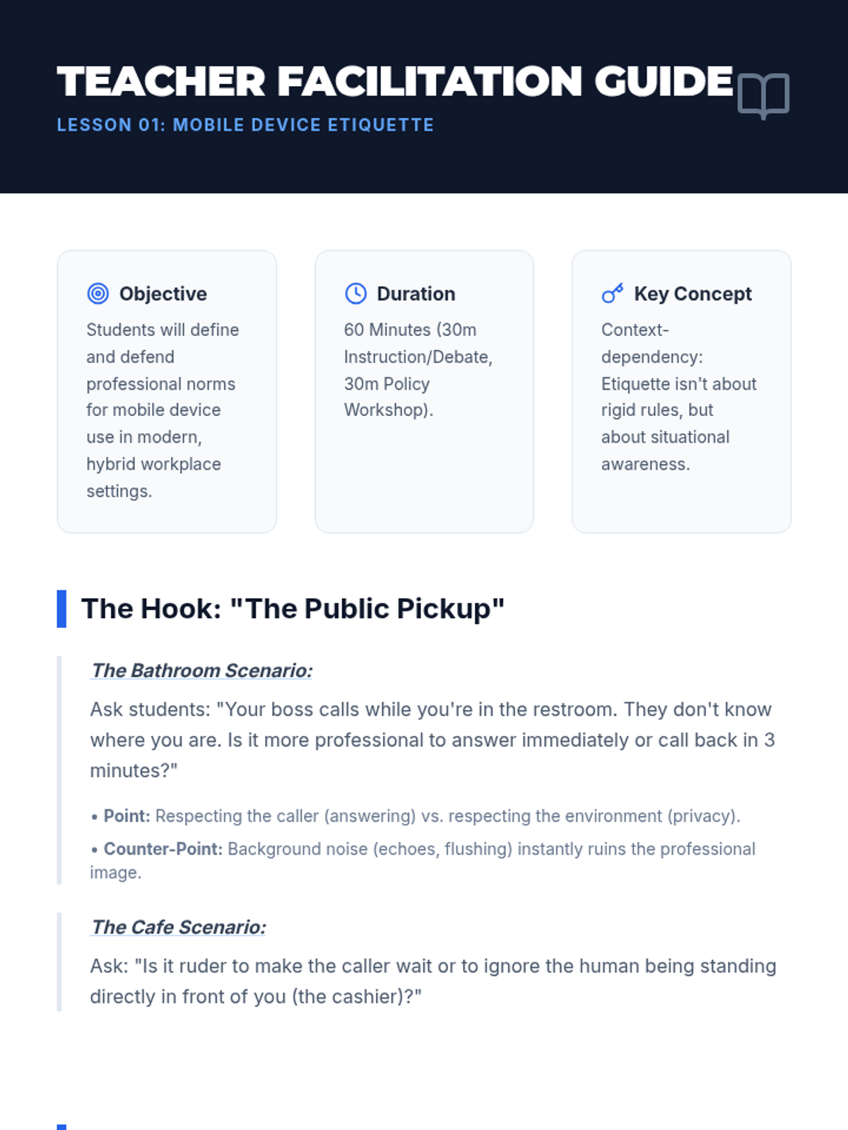 This inquiry-based sequence explores how mobile technology changes professional communication rules for 8th-grade students. They investigate etiquette for personal devices, privacy, speakerphone usage, and the decision between texting and calling, culminating in the creation of a workplace mobile usage policy.