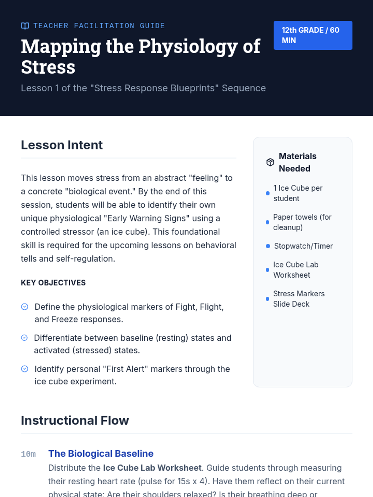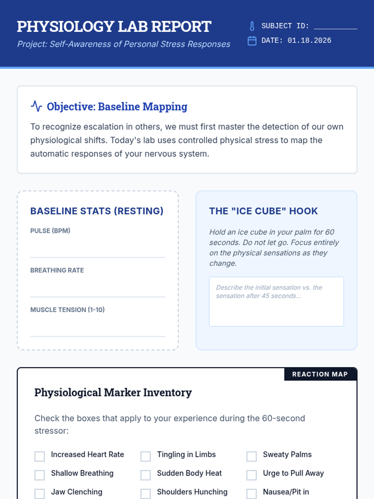 A 12th-grade sequence focused on developing self-awareness of personal stress responses. Students map their physiological and behavioral escalation signs to build empathy and professional self-regulation skills.