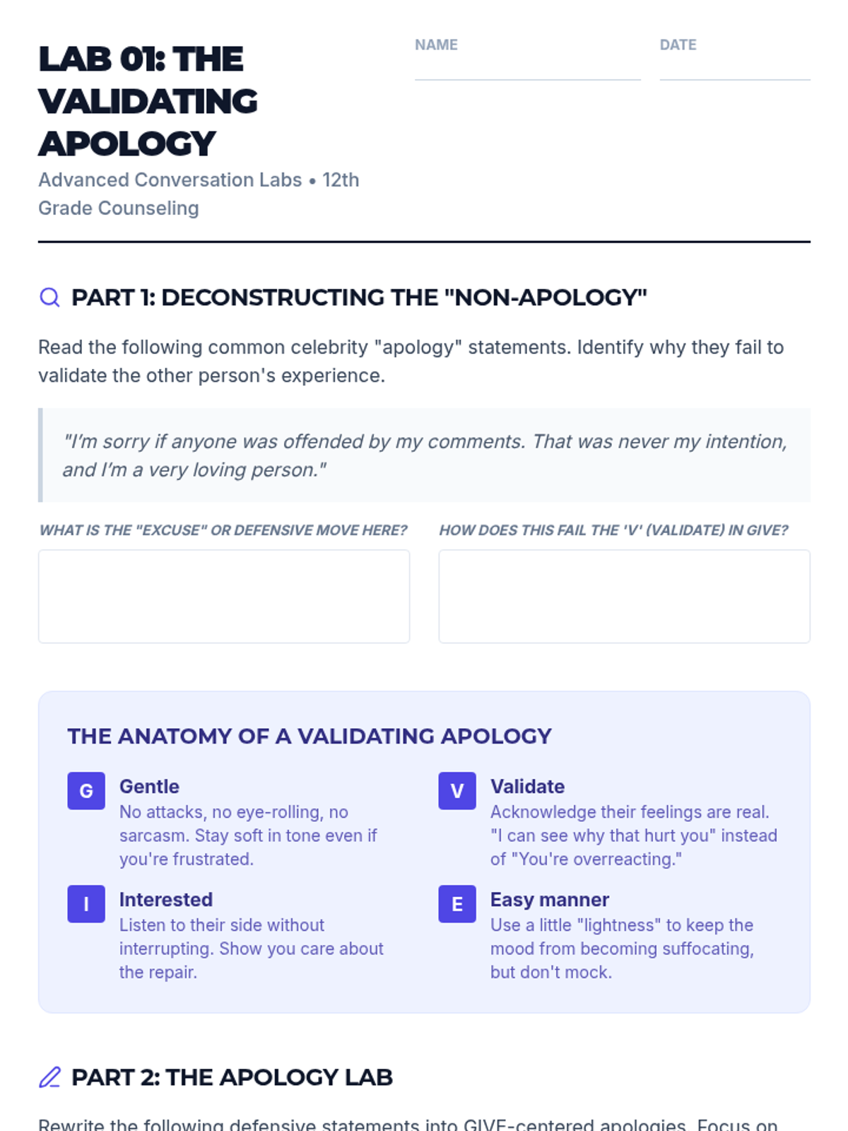 An advanced series of workshops for 12th graders focusing on the GIVE skills (Gentle, Interested, Validate, Easy manner) applied to real-world scenarios like apologies, refusals, networking, and digital conflict. Students move from theory to high-fidelity labs, preparing for professional and personal success post-graduation.