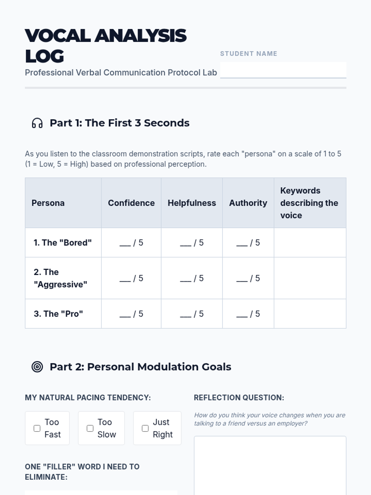 This sequence focuses on the auditory aspects of communication, specifically tone, pacing, and clarity, which are crucial when visual cues are absent. Students will record, analyze, and refine their speaking voices to convey competence and warmth, moving from self-diagnosis of speech habits to the production of polished voicemail recordings.