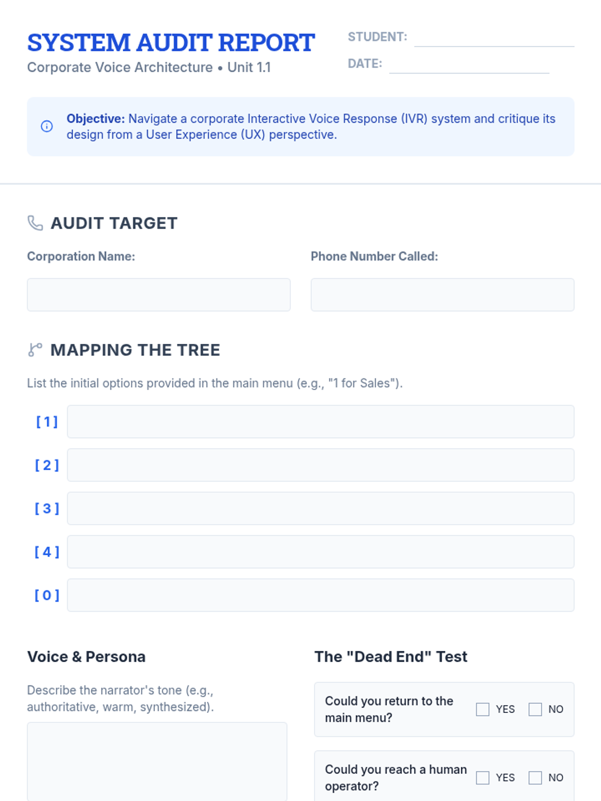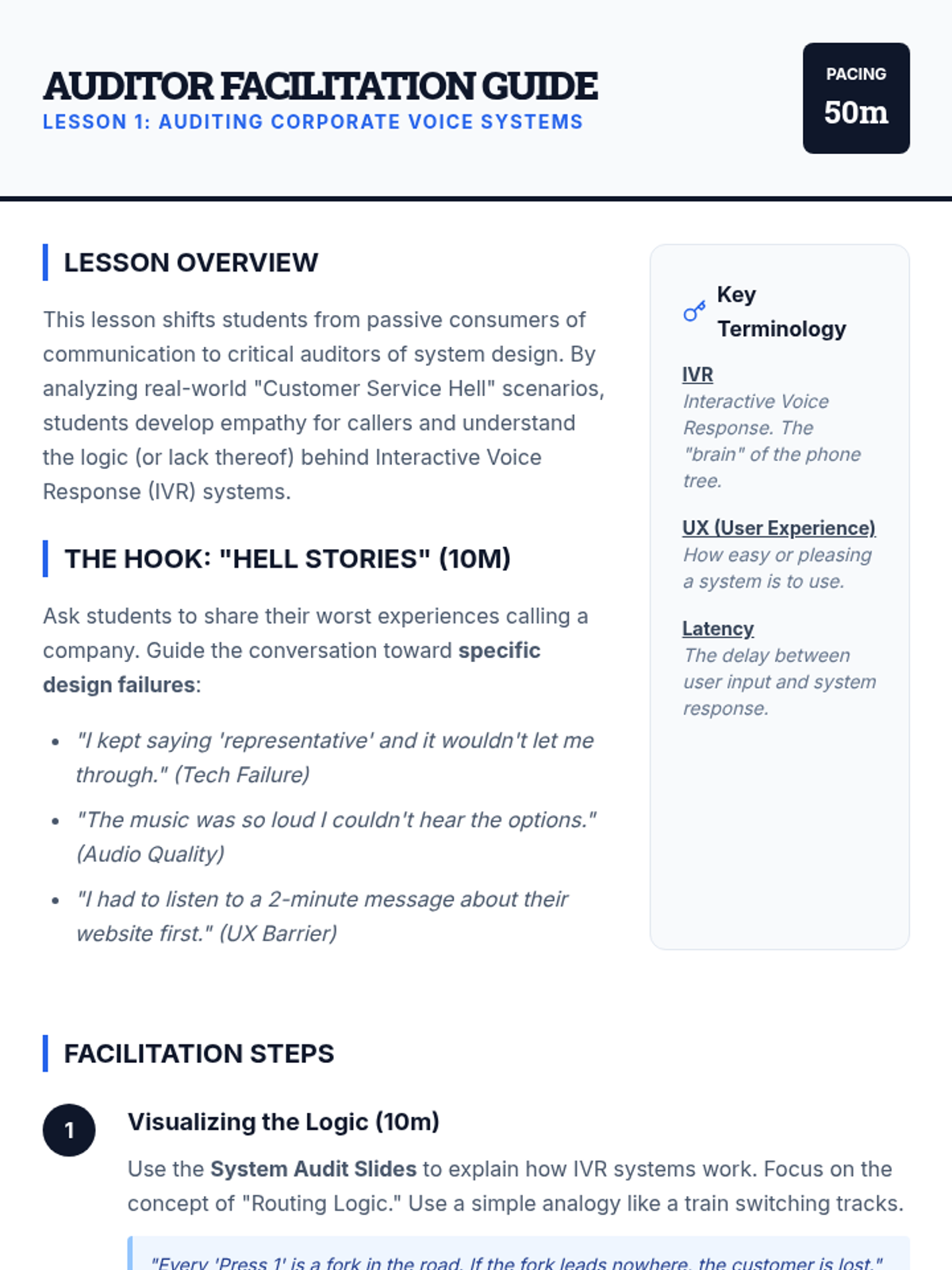 A project-based sequence where 12th-grade students design a corporate voice communication architecture, focusing on IVR logic, professional greetings, and actionable voicemail messaging. The curriculum emphasizes user experience (UX), technical writing, and professional verbal communication.