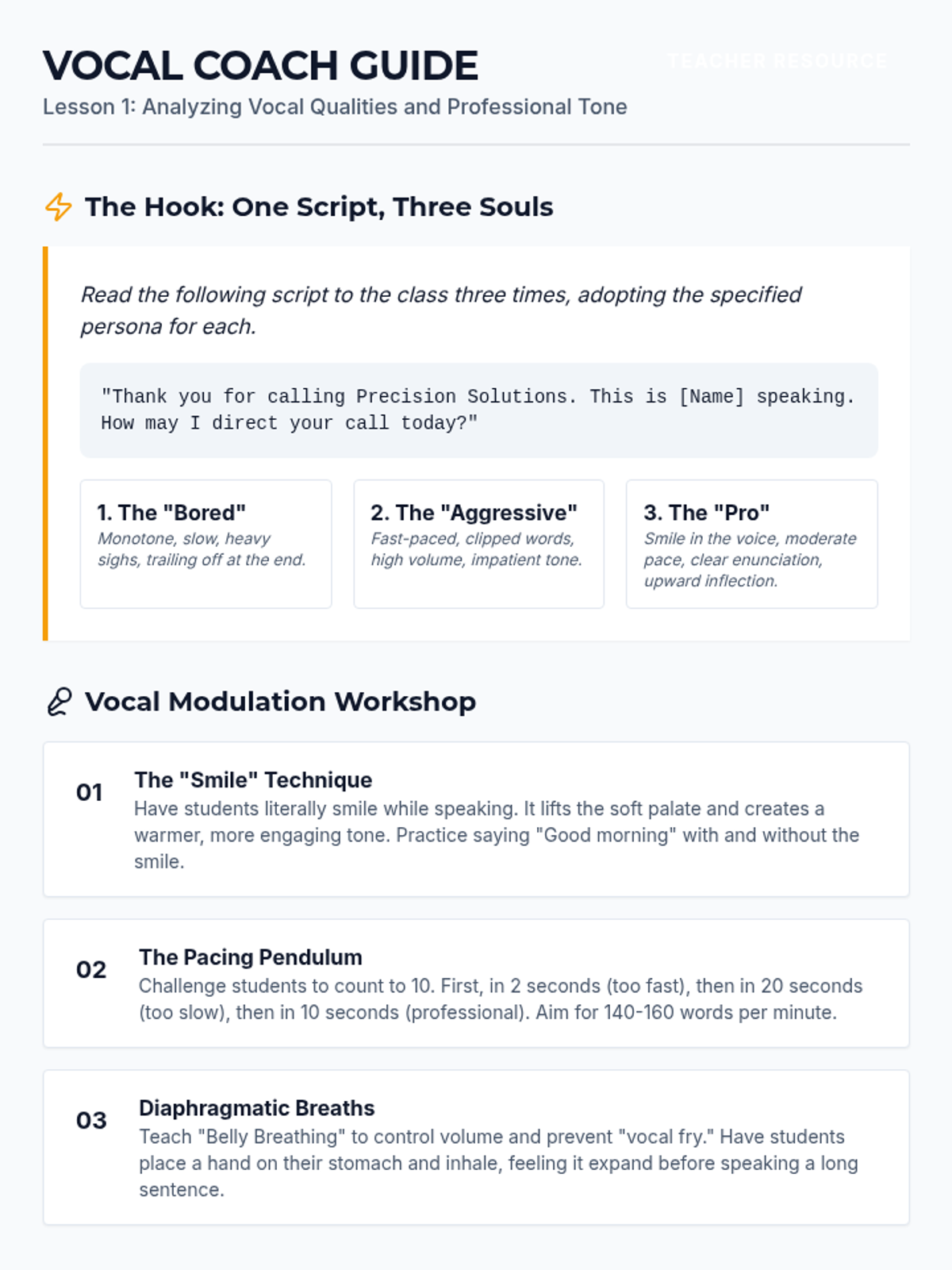 A game-based sequence focusing on the vocal mechanics of phone communication, including enunciation, pacing, volume, and emotional tone. Students build professional audio communication skills through interactive drills and simulations.