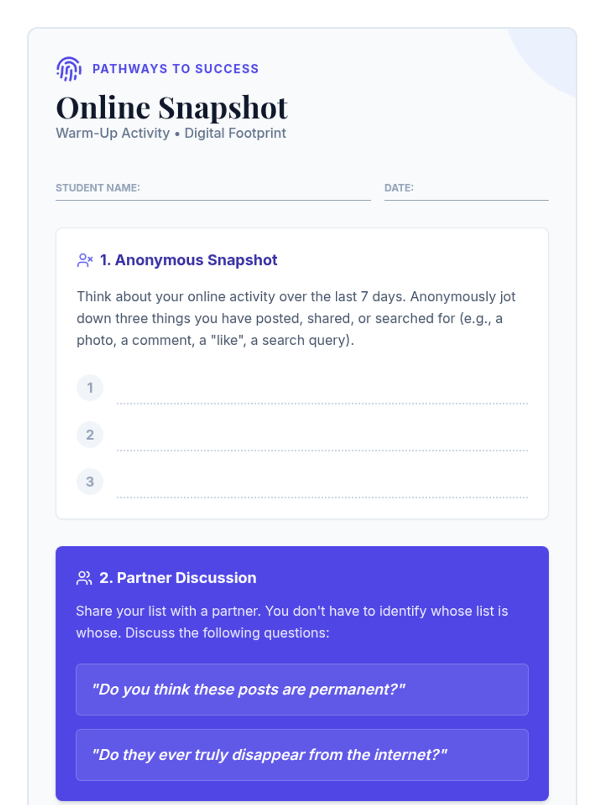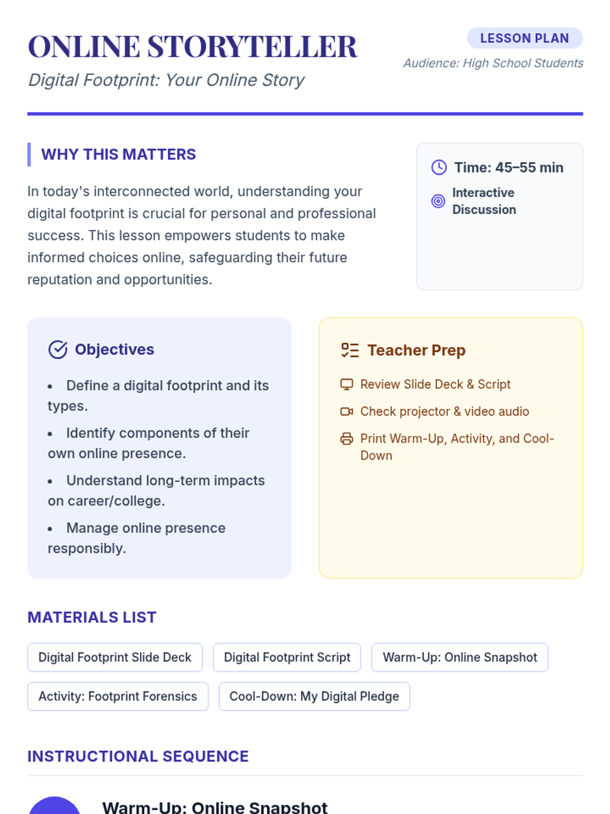 A comprehensive suite of lessons designed for high school students to master digital citizenship and essential executive function skills. Topics include digital footprint management, goal setting, time prioritization, organization, and overcoming procrastination.