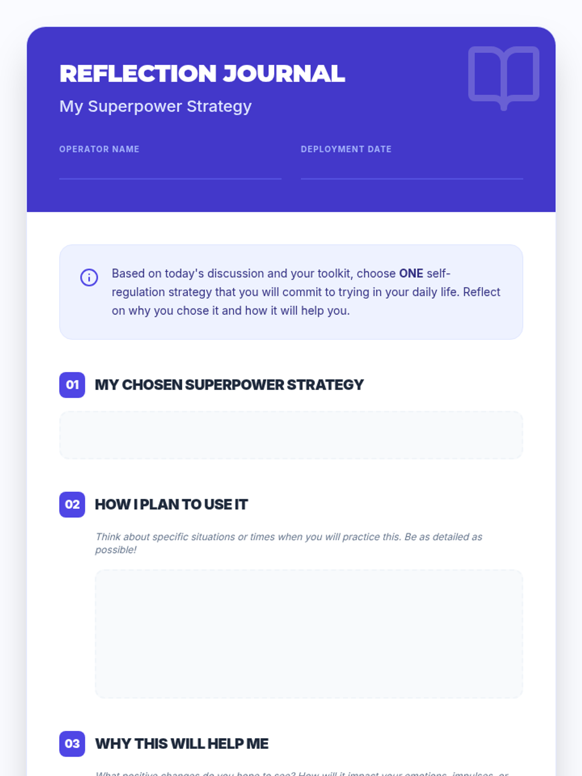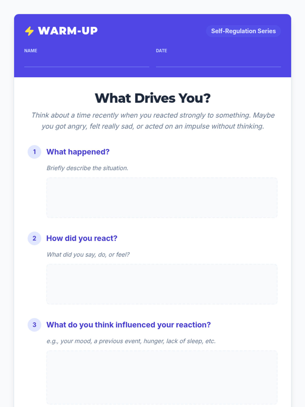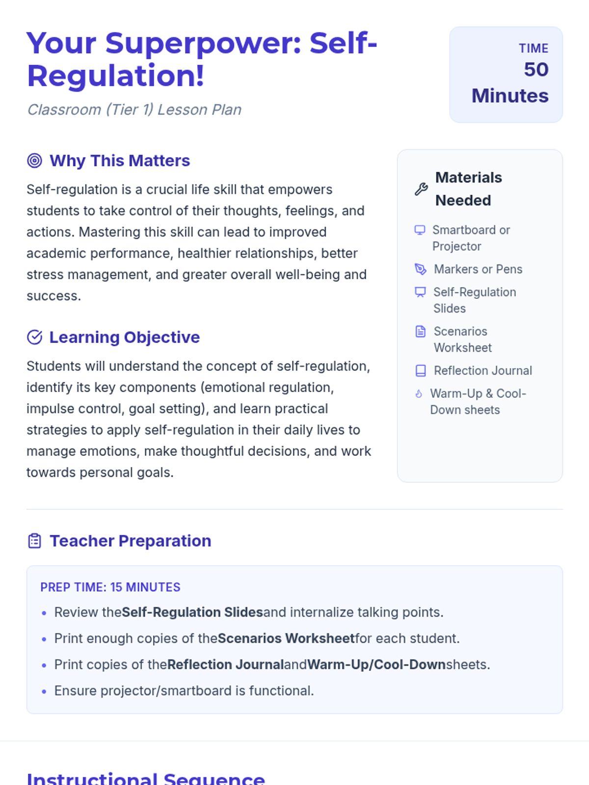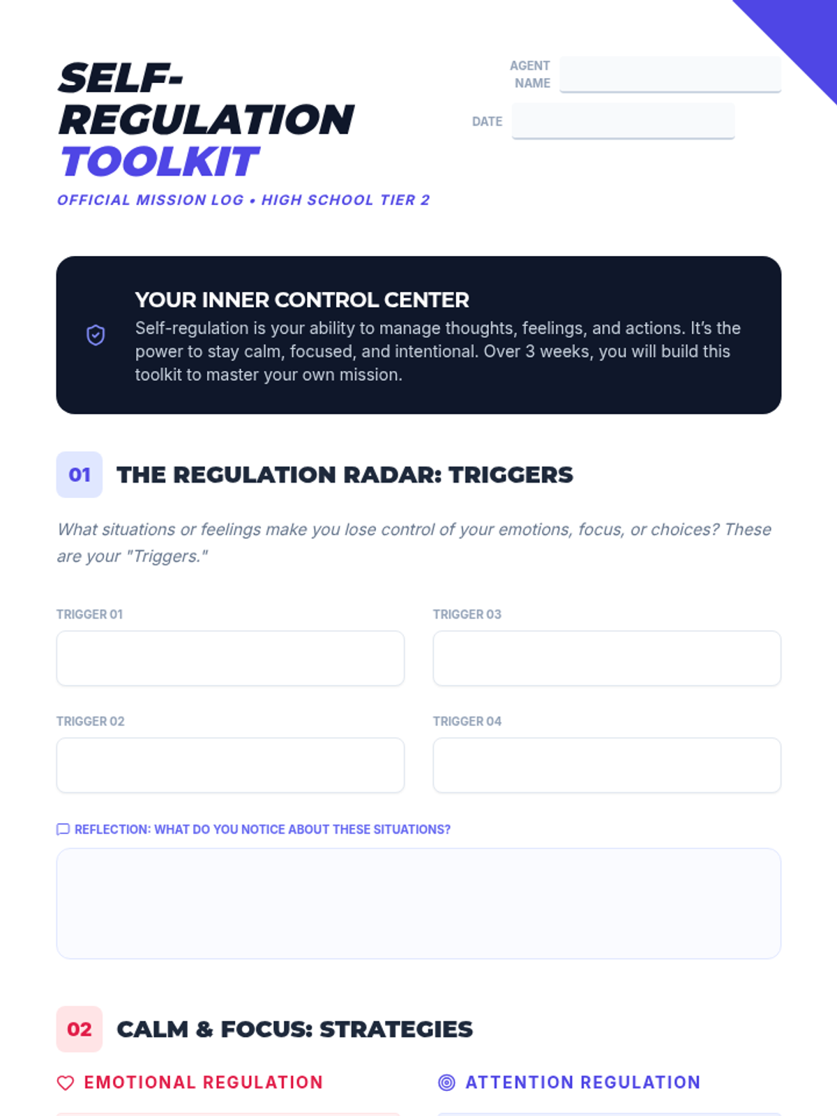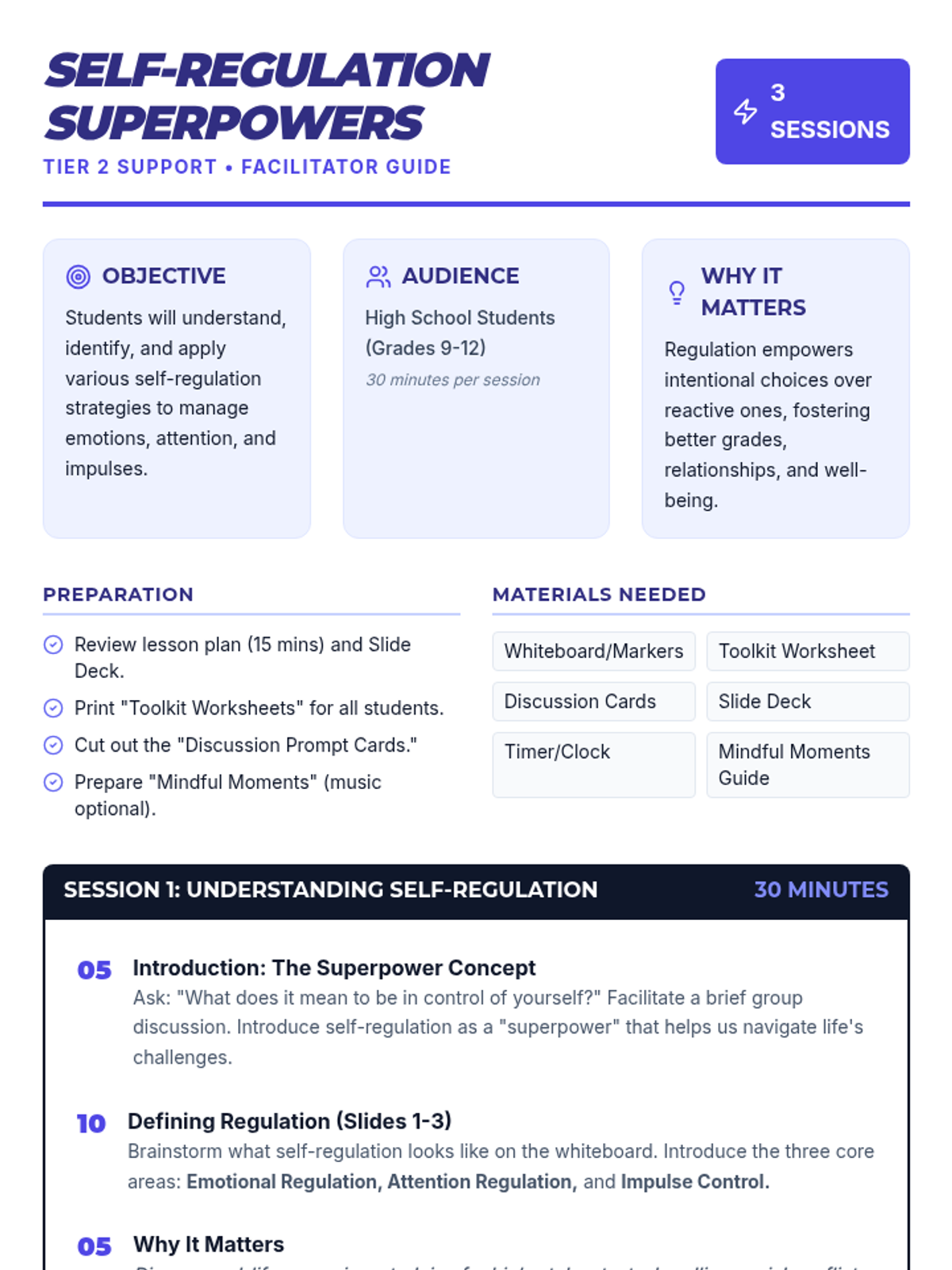 A 3-week, Tier 2 social-emotional learning sequence designed for high school students to develop self-regulation strategies for emotional management, attention focus, and impulse control.