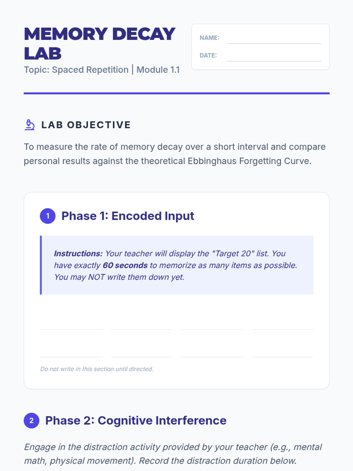 A comprehensive guide for 12th-grade students to master long-term memory through the science of spaced repetition and the physical implementation of a manual Leitner Box system. Students move from theoretical understanding of the Ebbinghaus Forgetting Curve to practical system management and self-regulation.