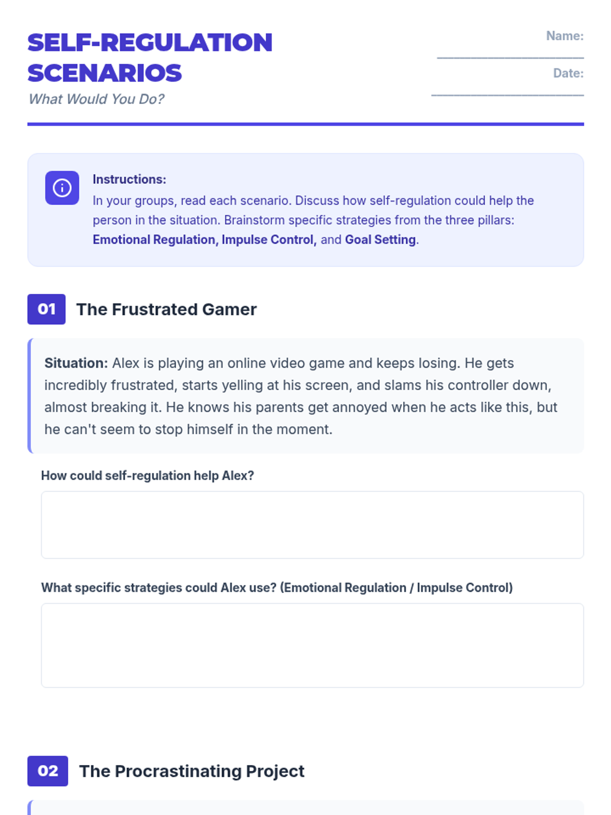 Stop-and-think strategies, impulse management, and SMART goal setting for personal growth. Develops internal motivation, stress reduction techniques, and resilience through proactive planning and monitoring.