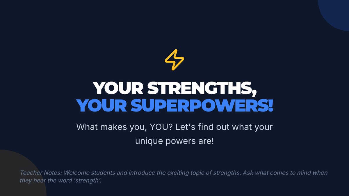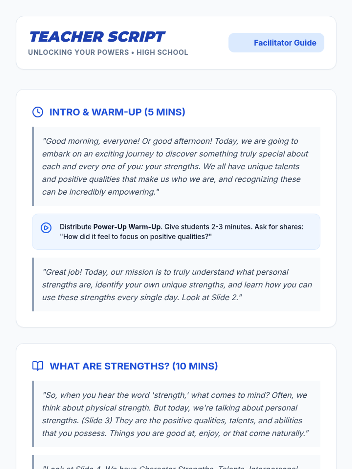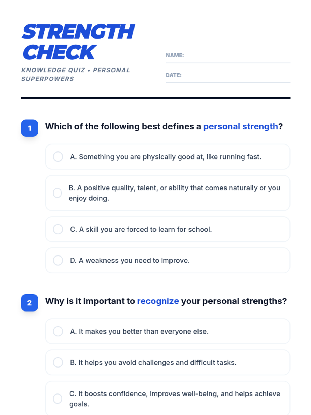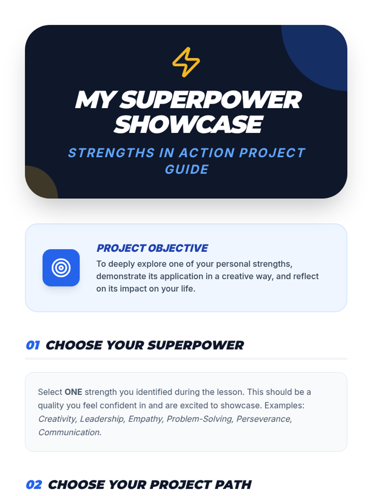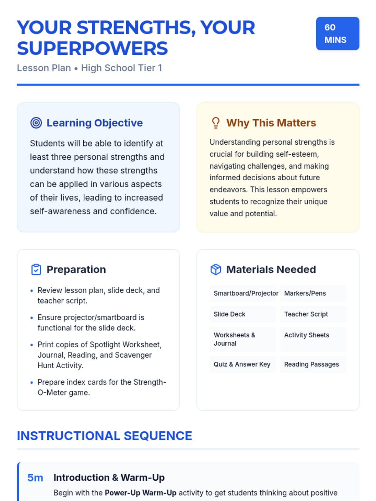 A comprehensive two-part sequence designed for high school students to identify, understand, and leverage their personal strengths. Through interactive activities, self-reflection, and collaborative discussion, students discover their 'inner superpowers' to boost confidence and academic success.
