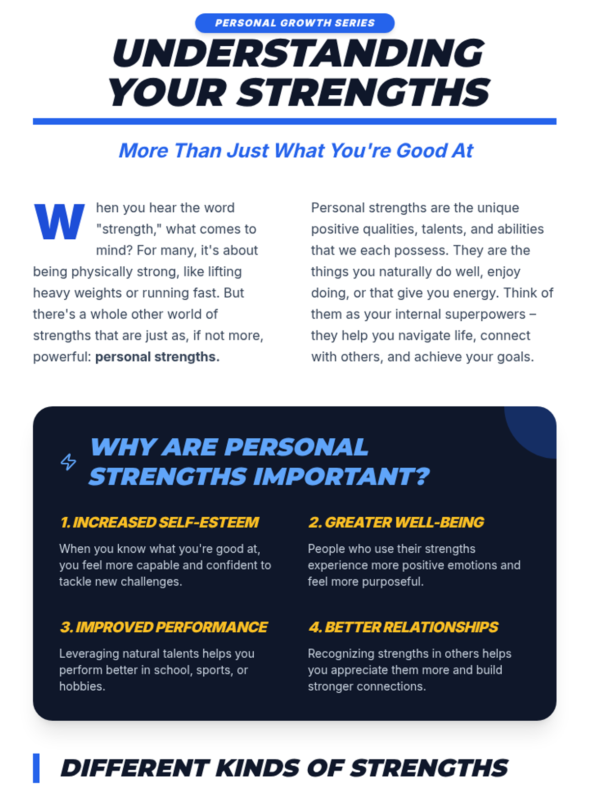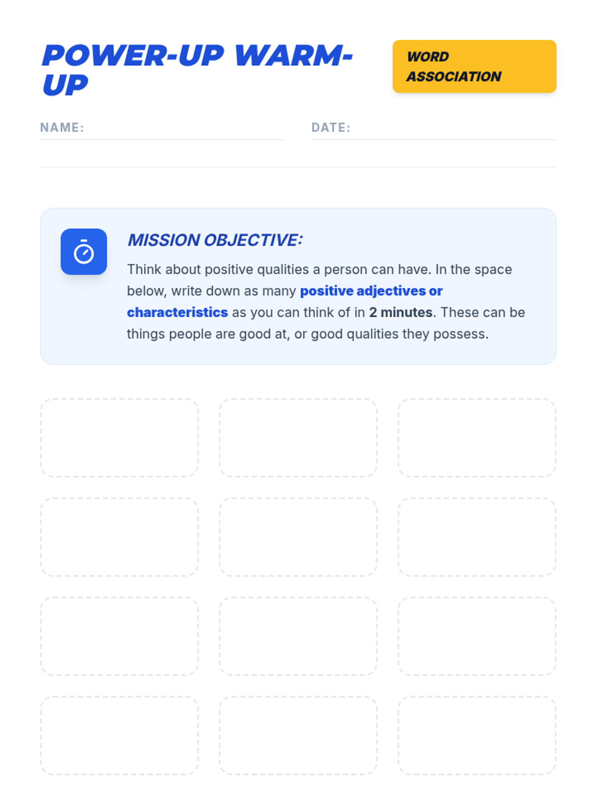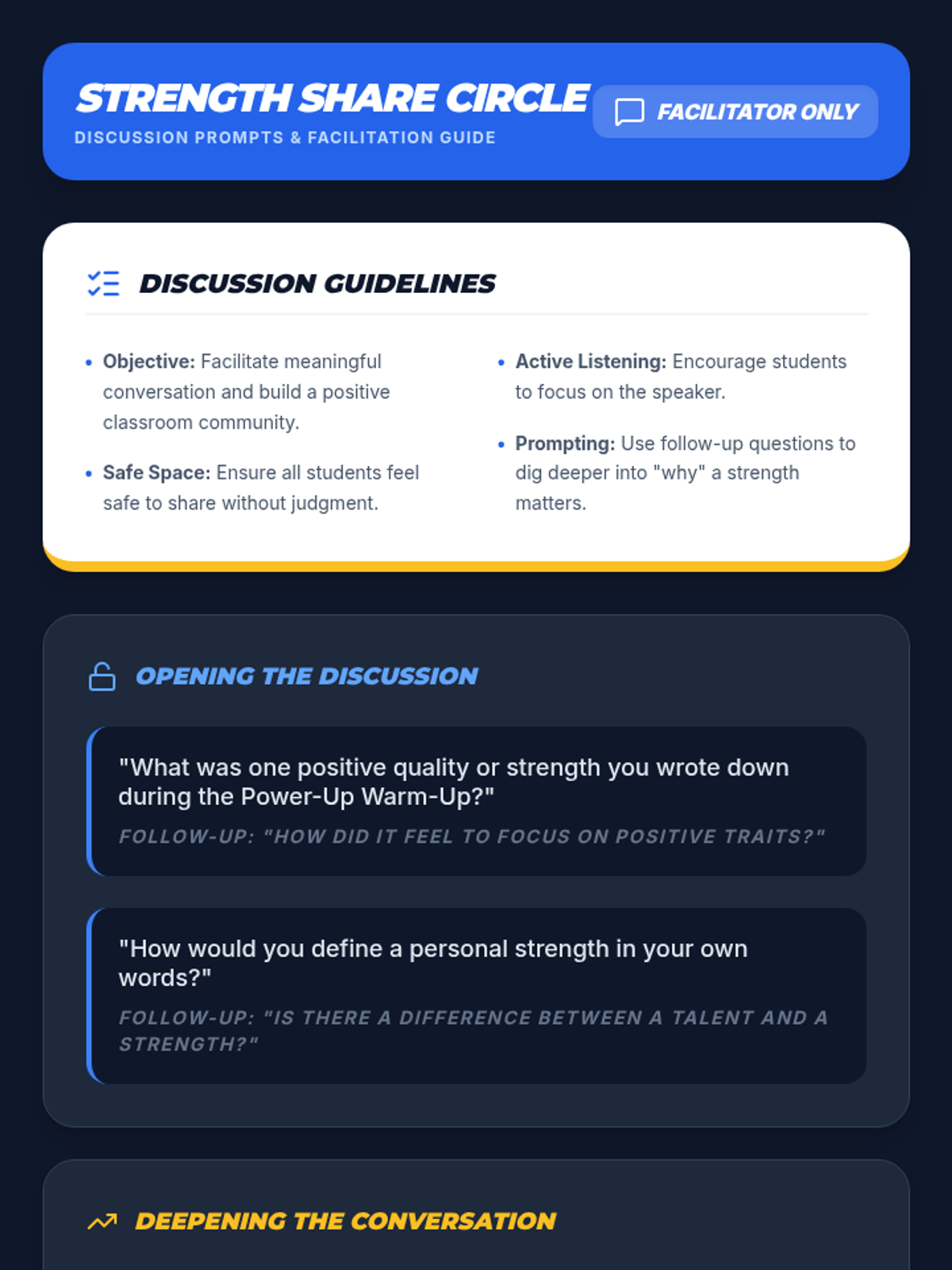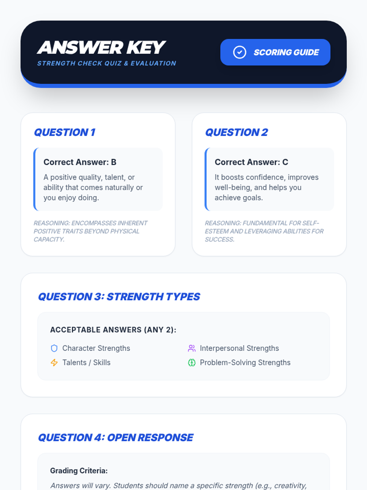 A comprehensive two-part sequence designed for high school students to identify, understand, and leverage their personal strengths. Through interactive activities, self-reflection, and collaborative discussion, students discover their 'inner superpowers' to boost confidence and academic success.