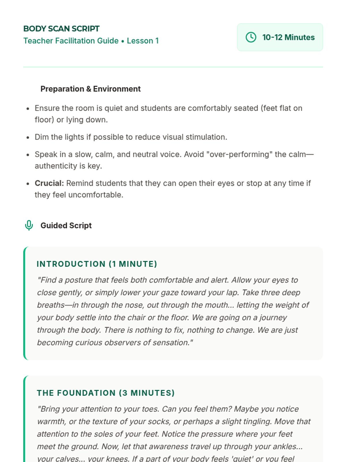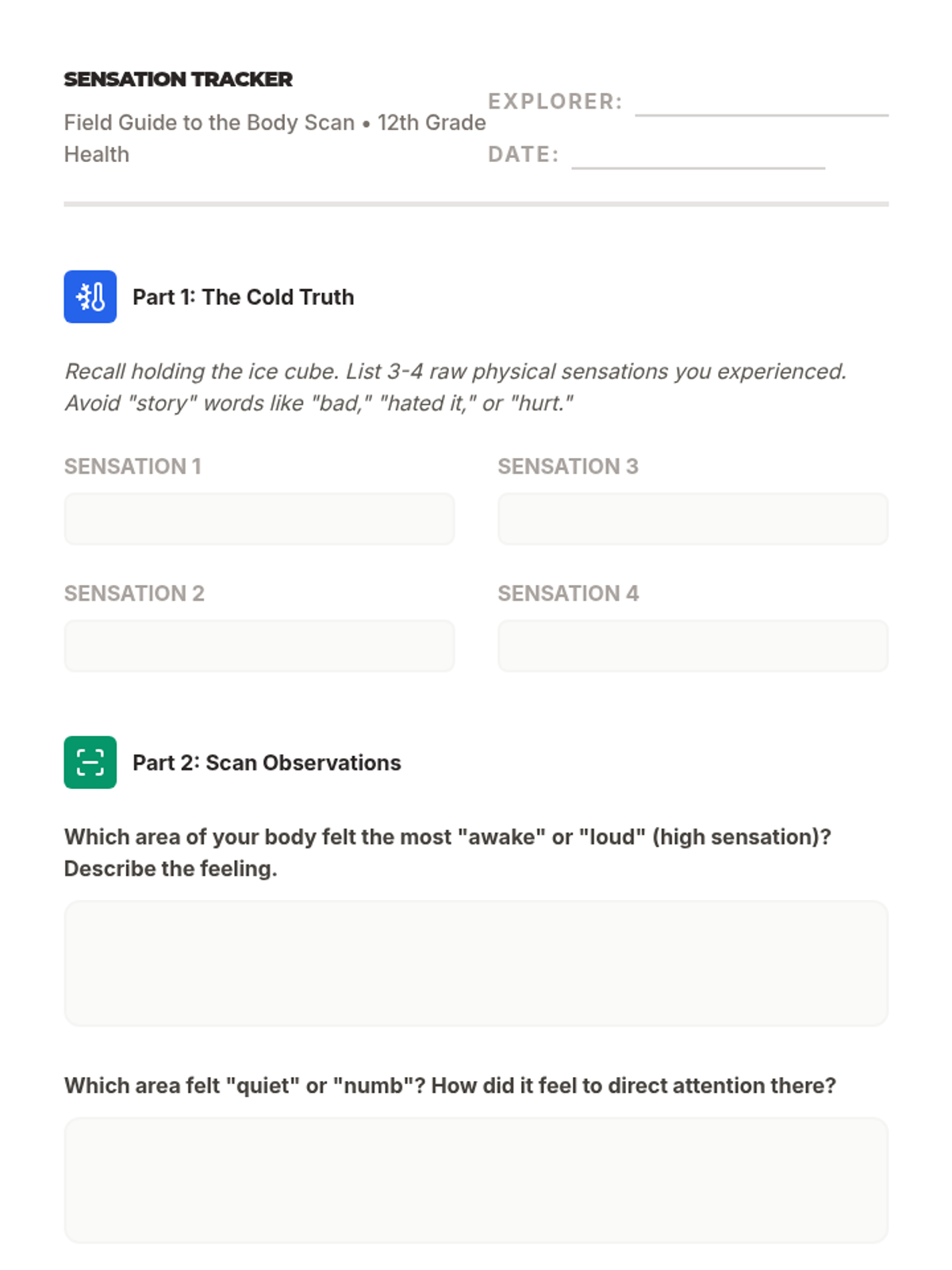 A 12th-grade sequence focused on somatic awareness and emotional regulation. Students learn to use body scanning, the R.A.I.N. technique, and urge surfing to build resilience and emotional intelligence.
