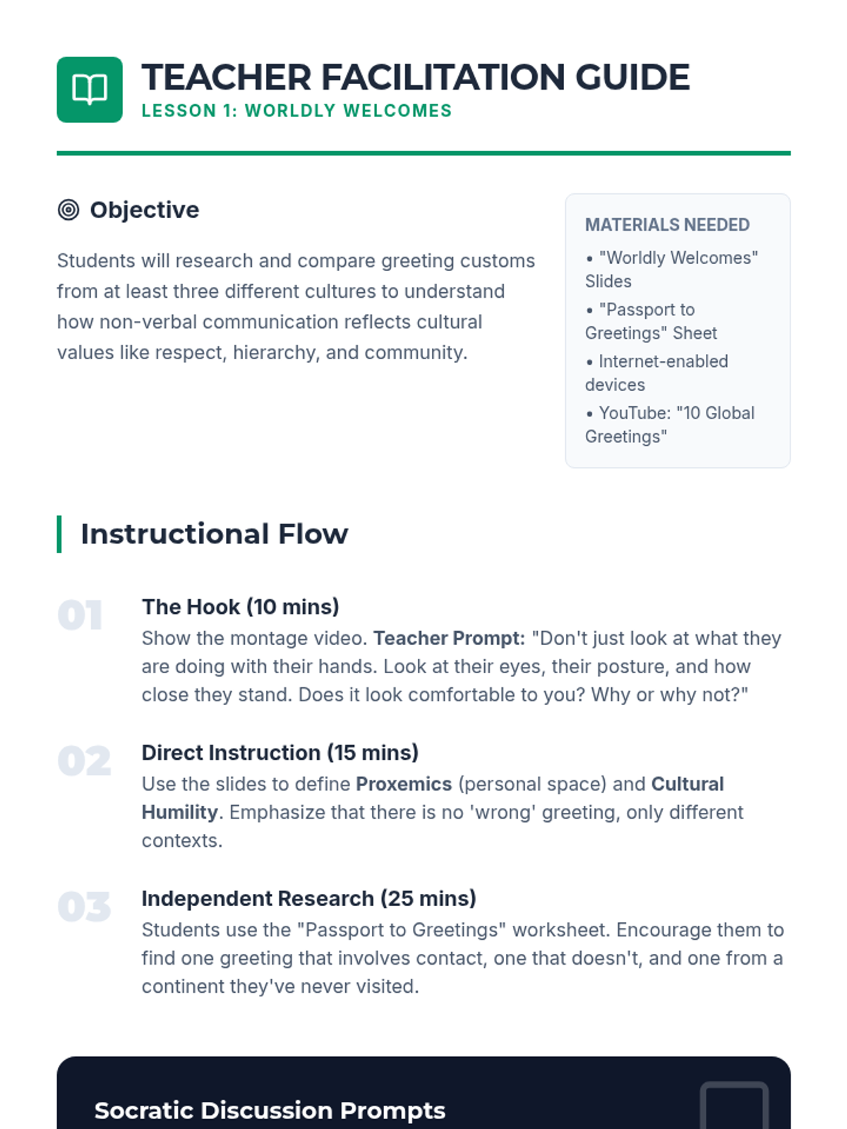 A 12th-grade social communication sequence exploring greeting etiquette across cultures, sub-cultures, and neurodivergent perspectives to build cultural humility and social adaptability.