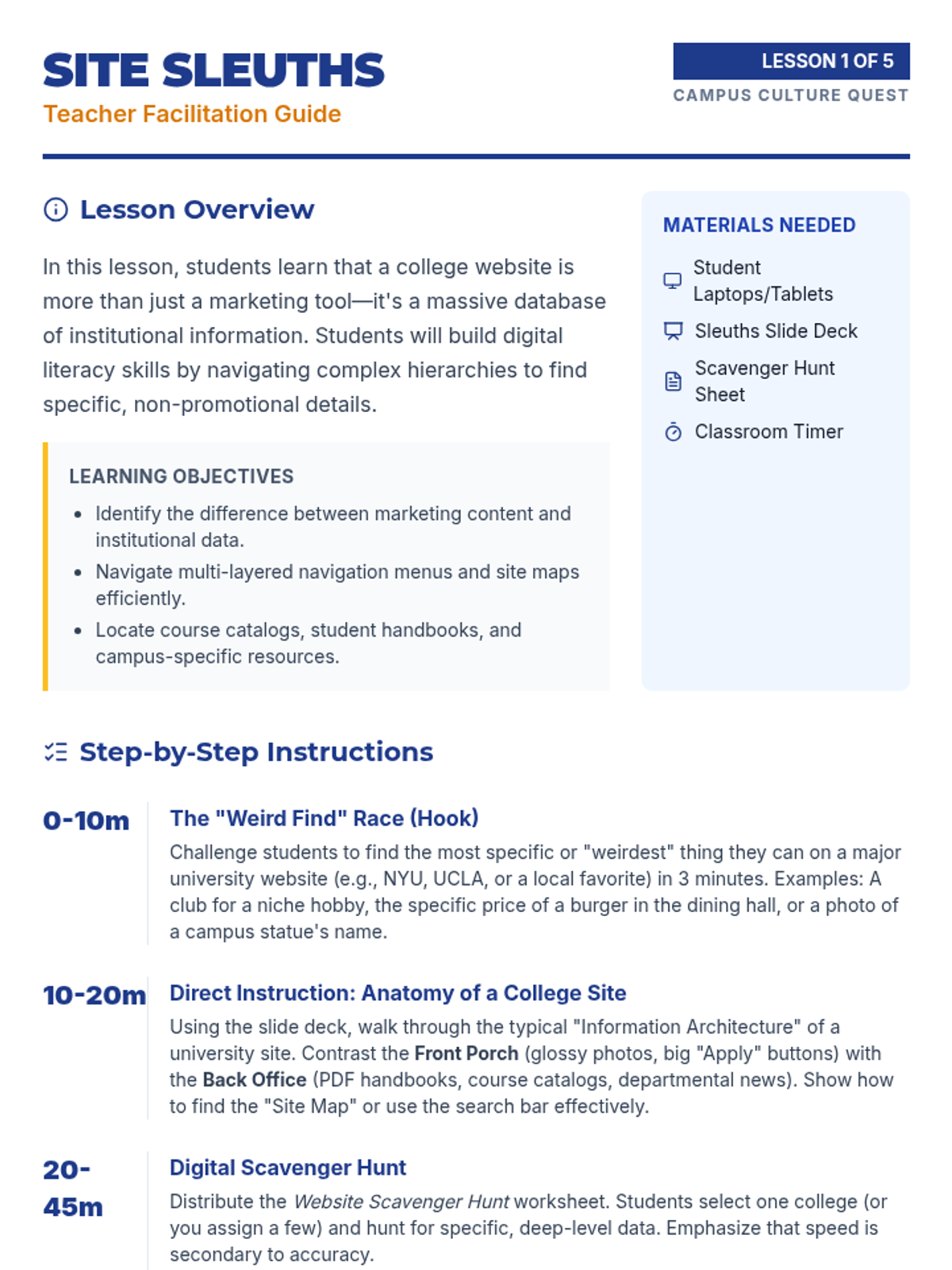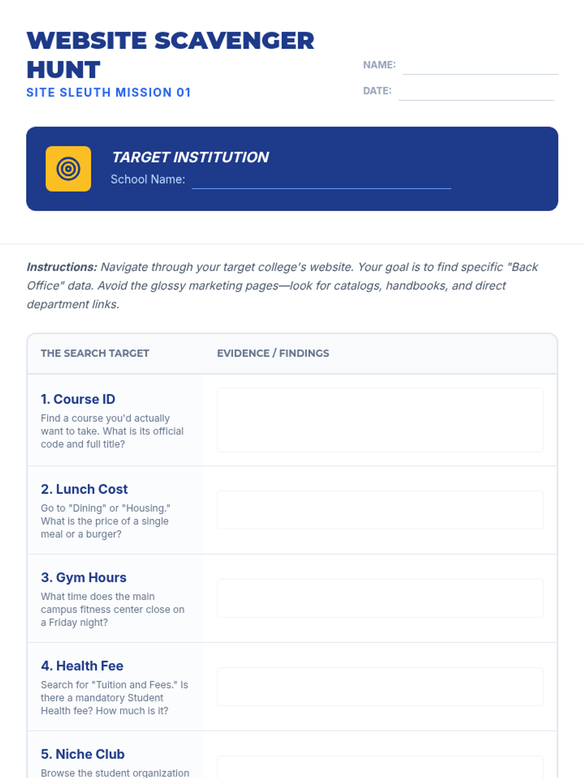 This sequence guides 11th-grade students through a qualitative evaluation of college campus culture and support systems. Students transition from surface-level marketing to deep-dive research using virtual tools, student media, and demographic data to determine authentic 'cultural fit'.