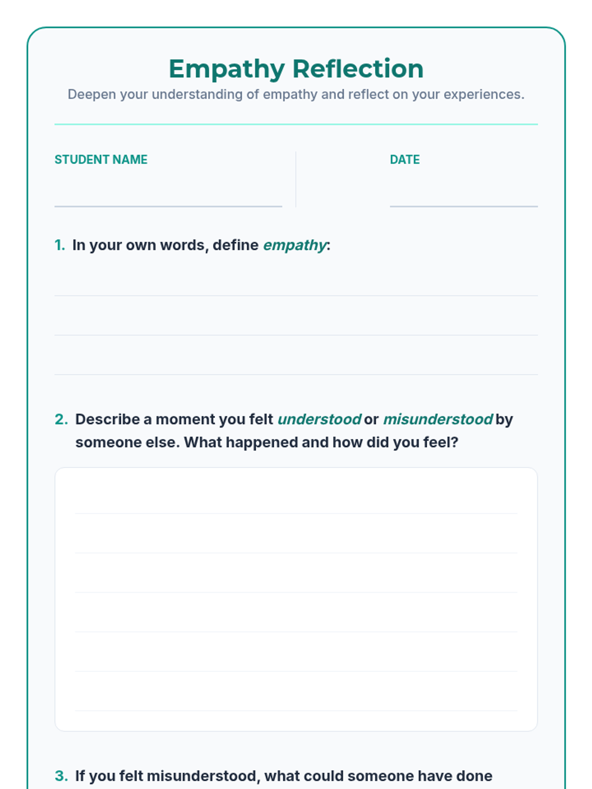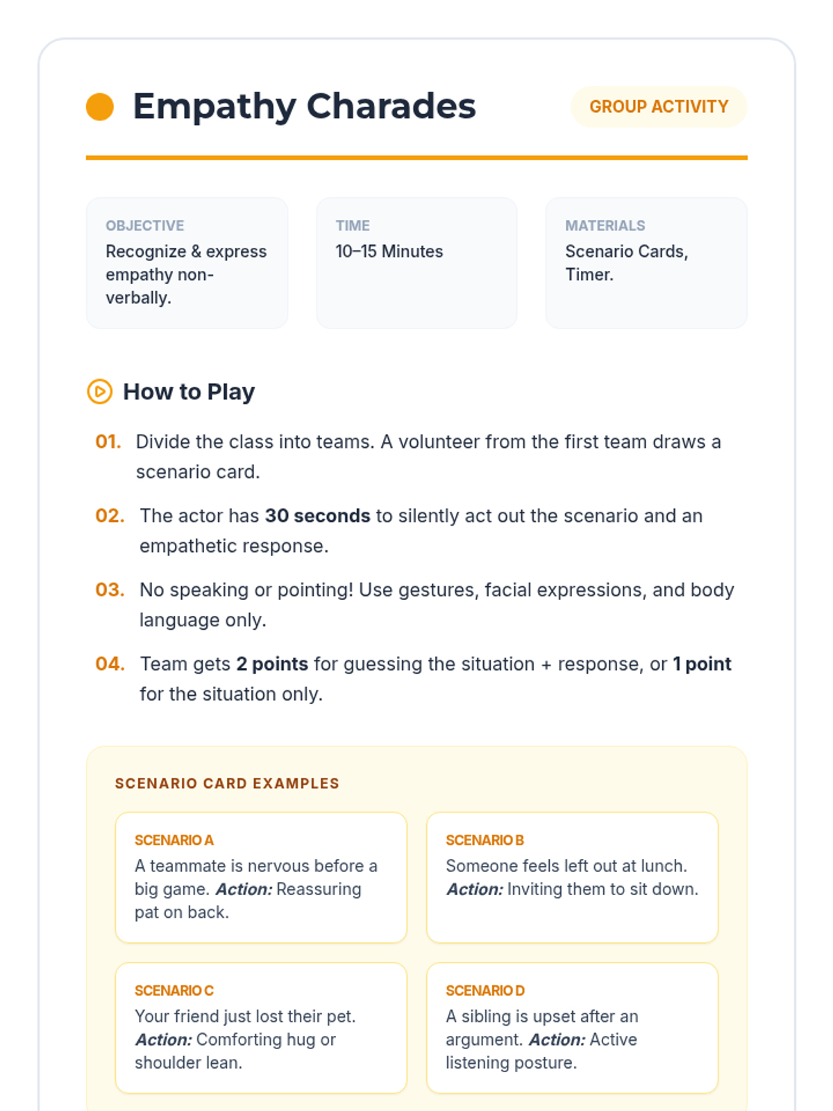 Empathetic skill development through emotion recognition, cultural diversity appreciation, and bias confrontation. Targets multi-perspective analysis to support respectful interactions and complex social responses.