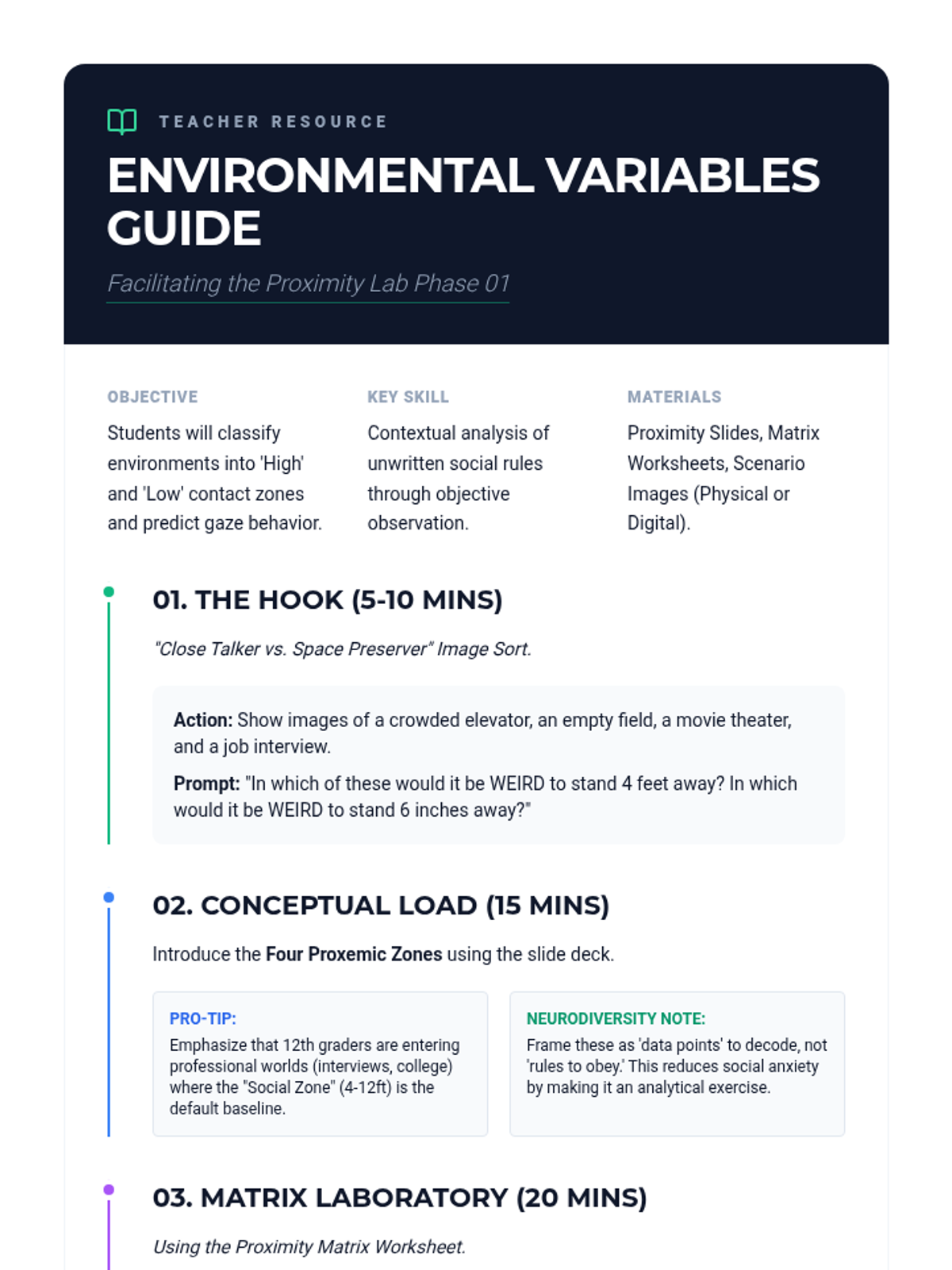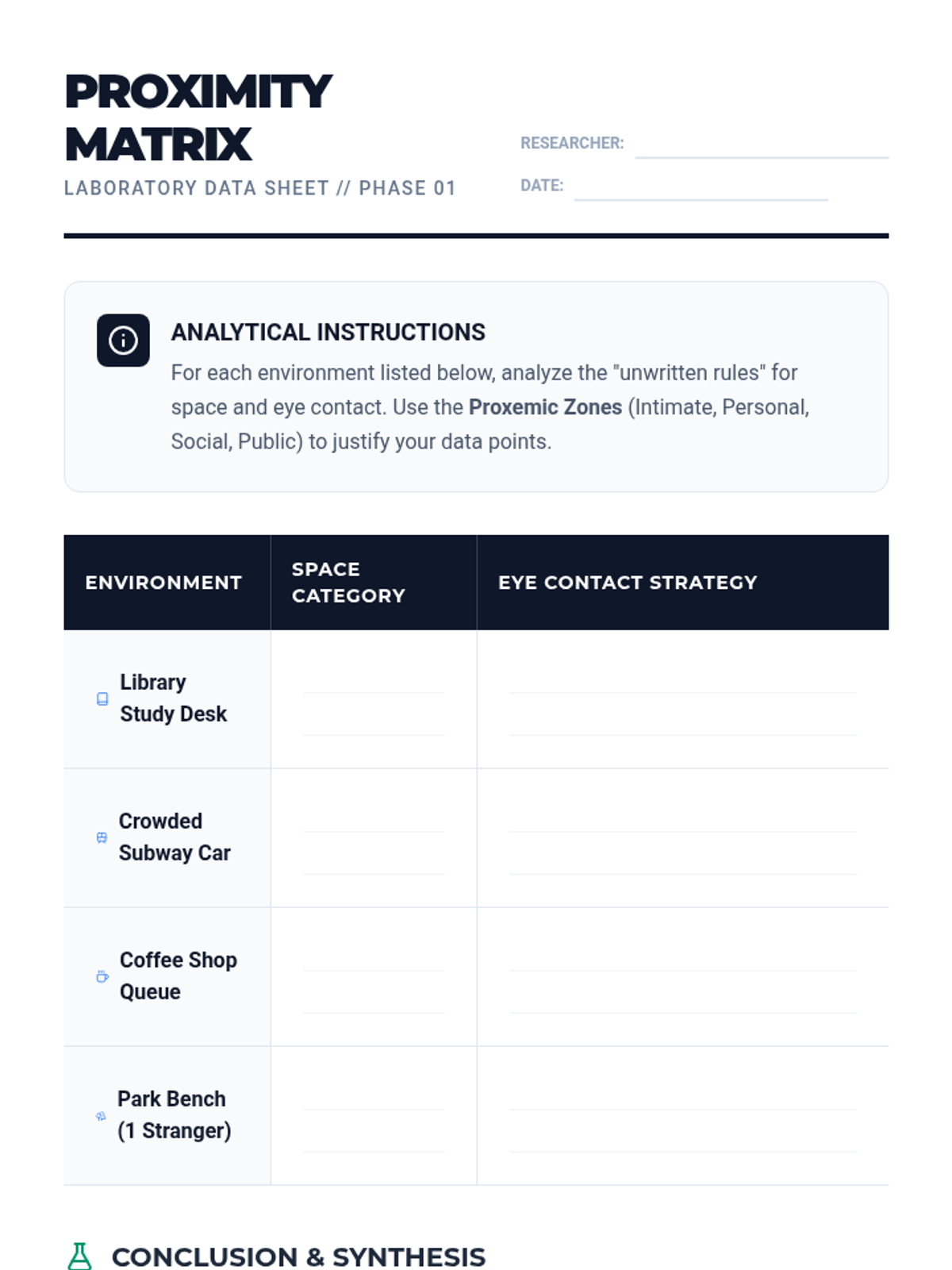 An analytical approach to social communication for 12th-grade students, focusing on how environmental, cultural, and digital variables influence eye contact and personal space norms. Students decode 'unwritten rules' through data-driven analysis and case studies.