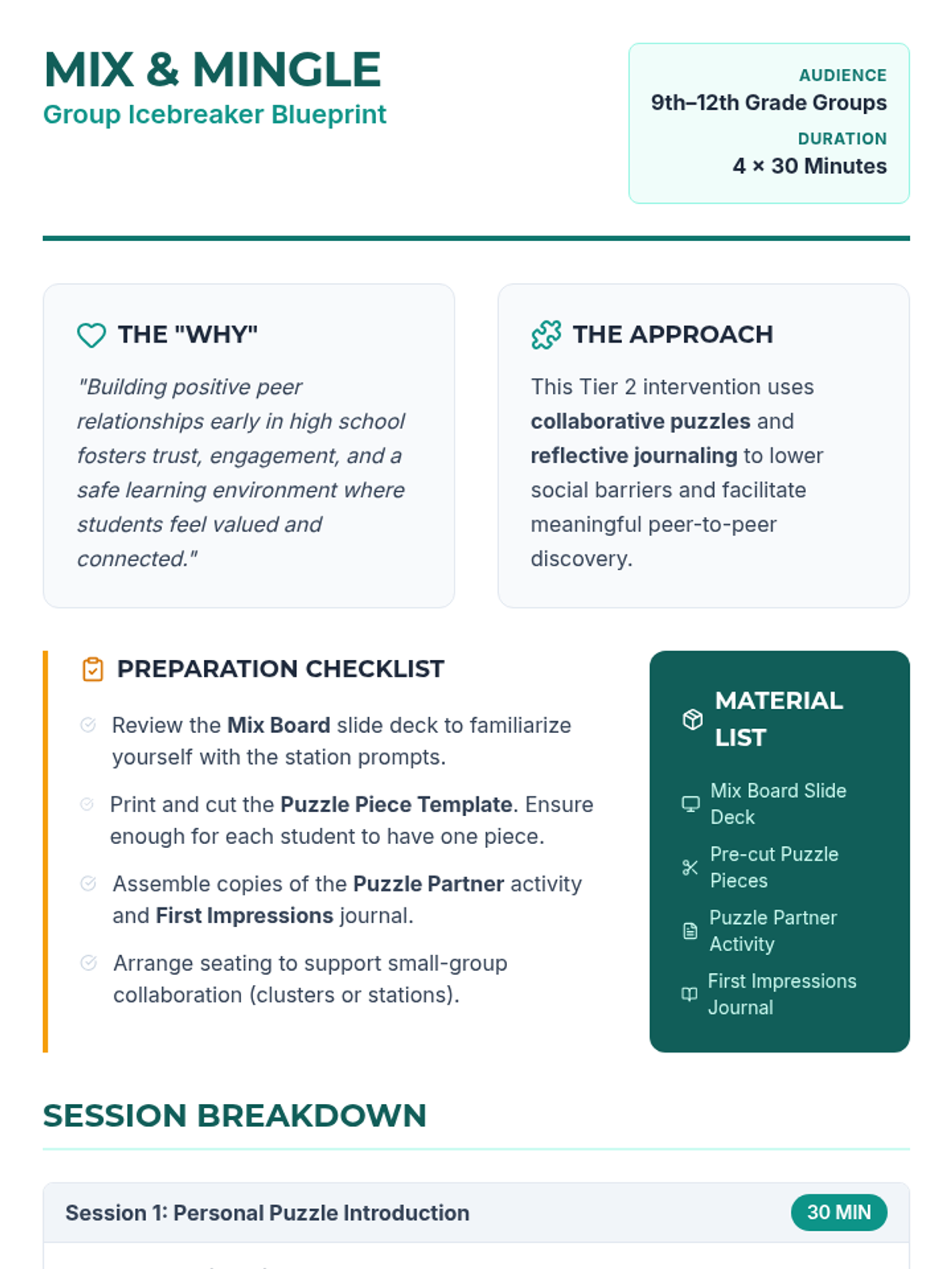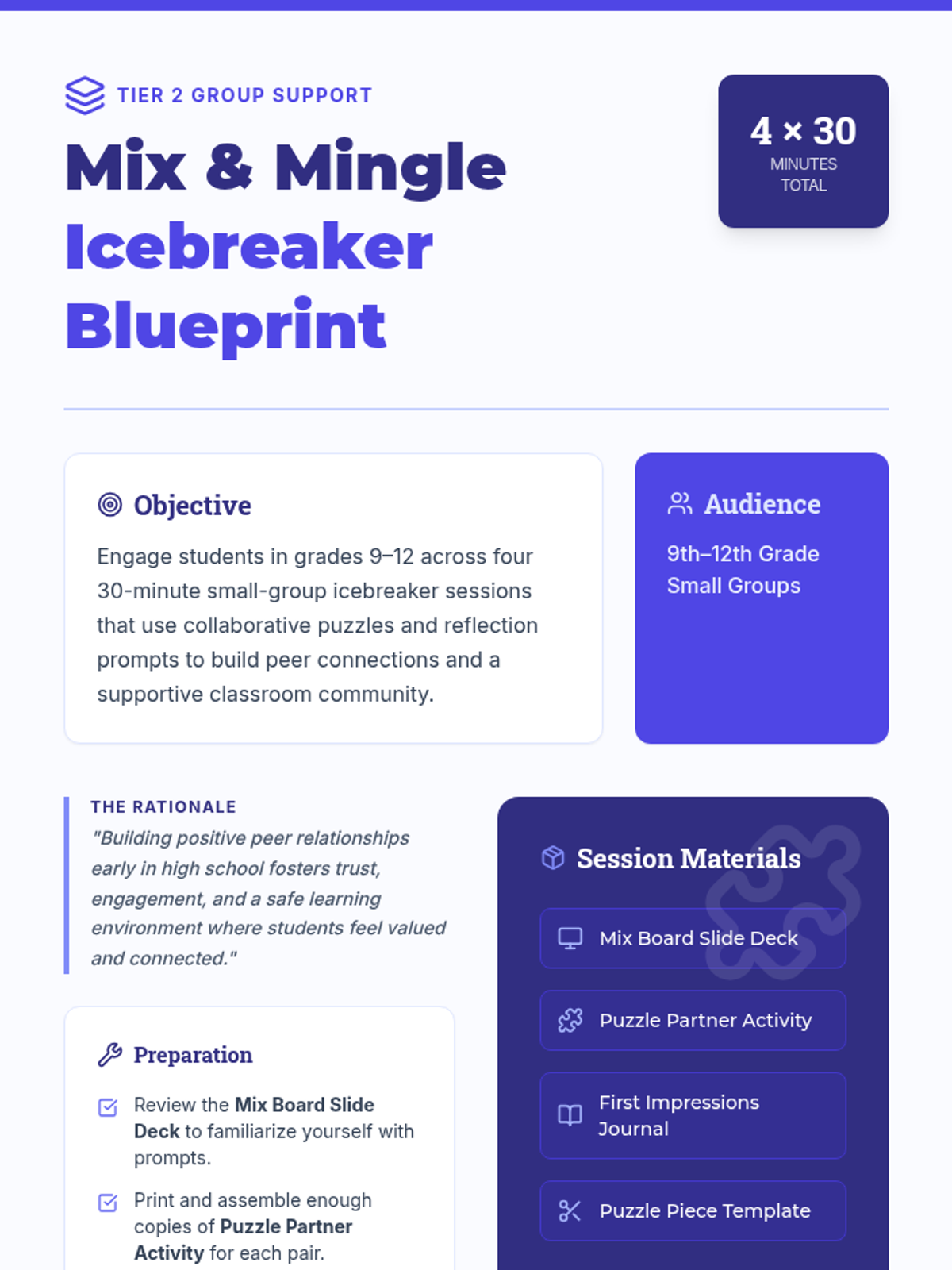 A four-session Tier 2 small-group icebreaker sequence for high school students, using collaborative puzzles and reflective journaling to build a supportive classroom community.