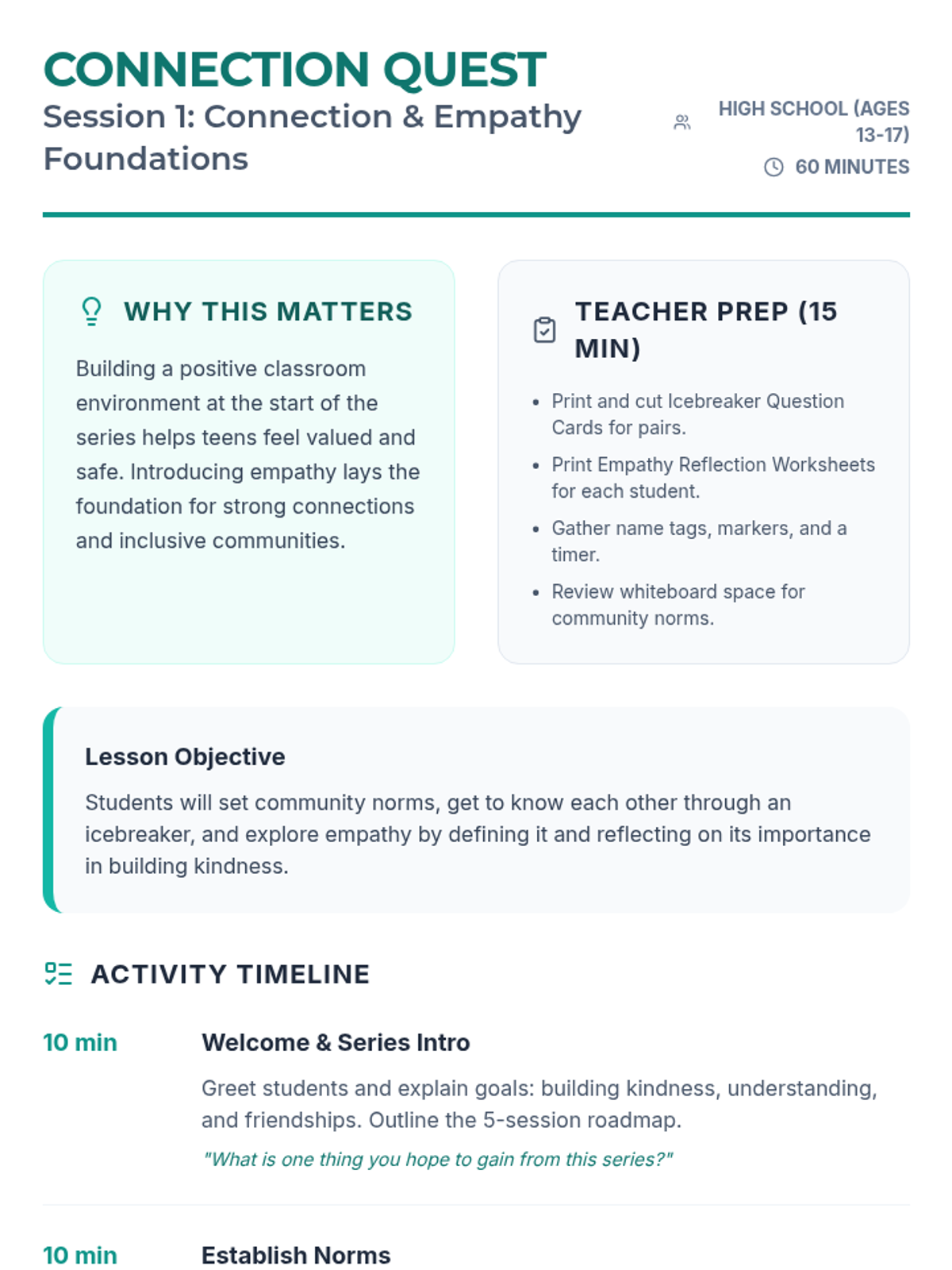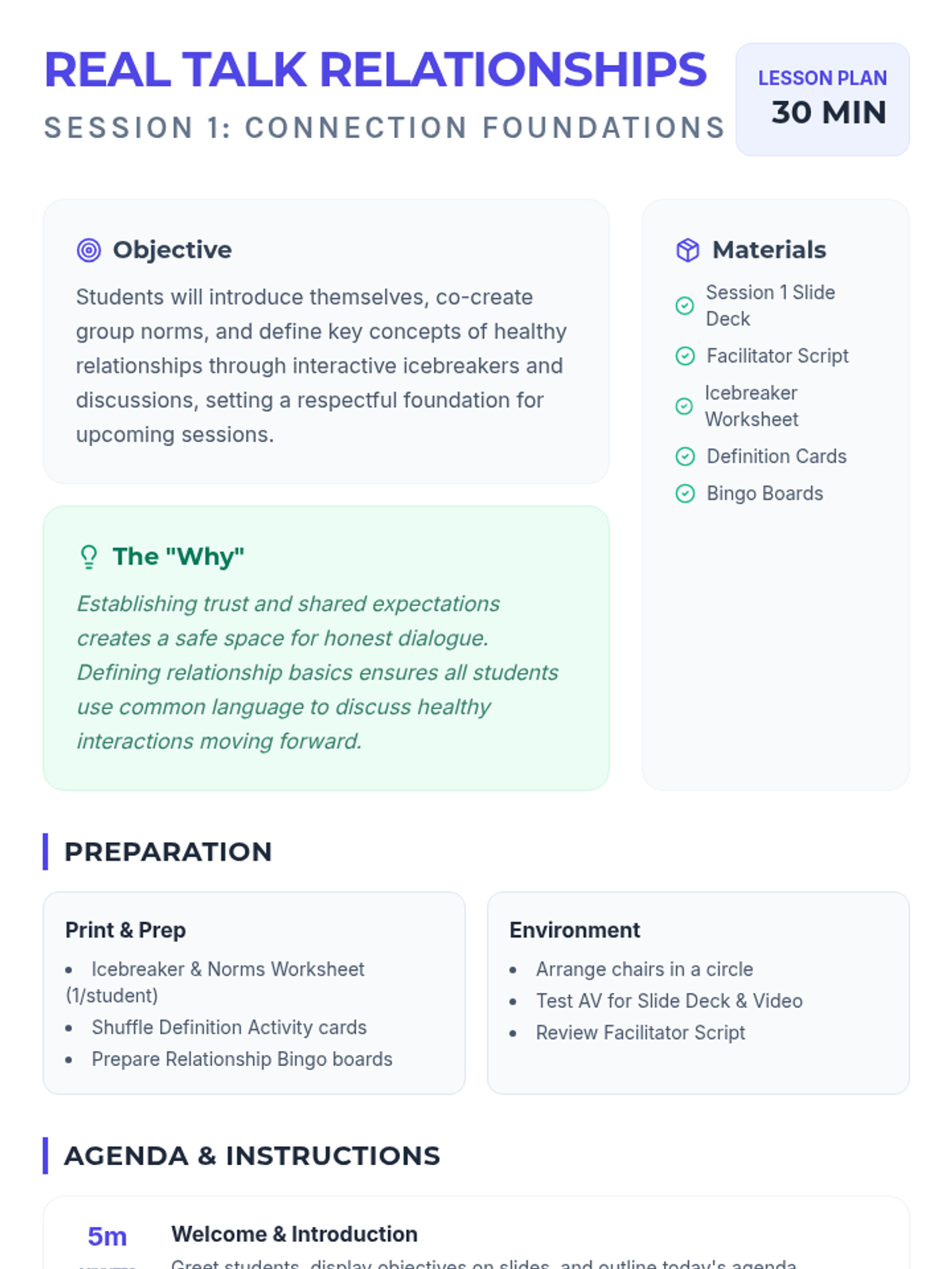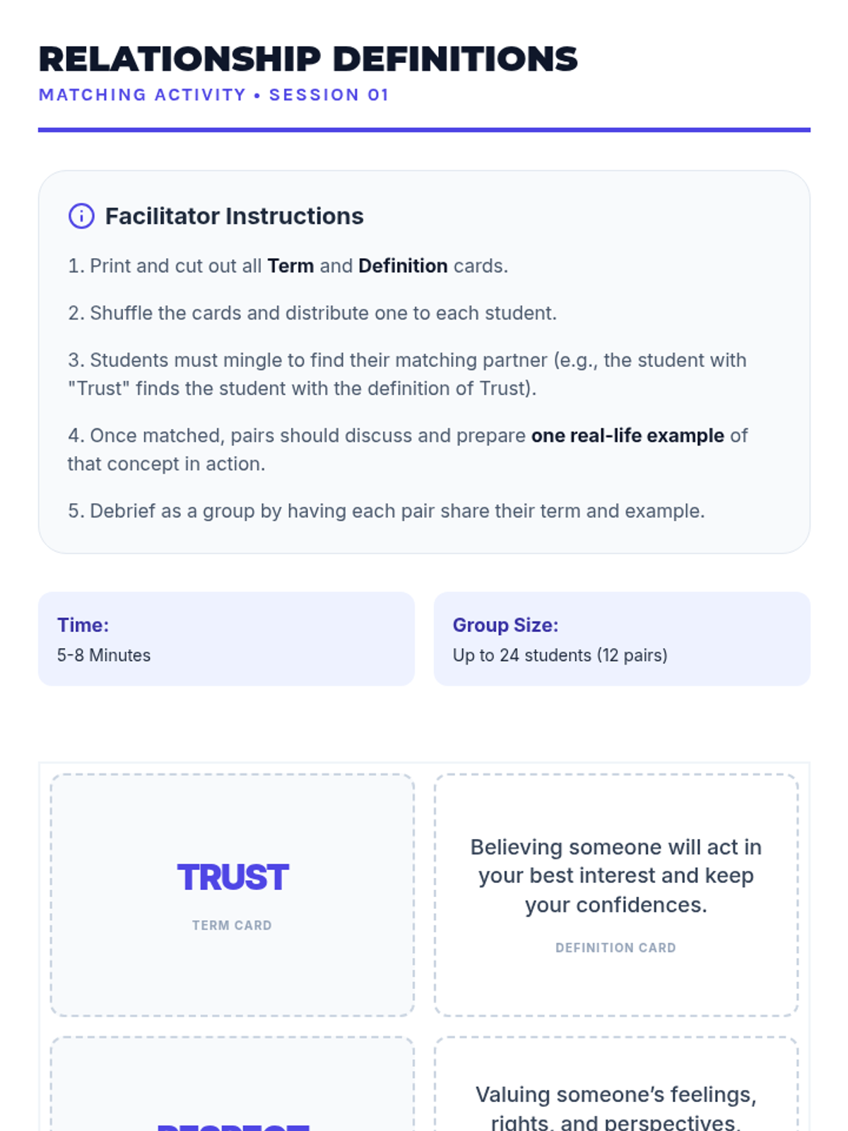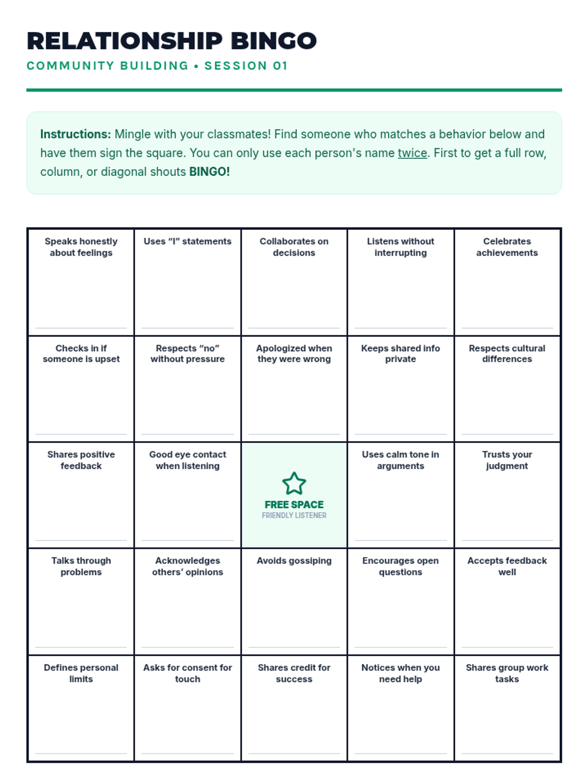 A 10-session comprehensive course for high school students focused on building healthy romantic, platonic, and digital relationships through communication, boundaries, and empathy.