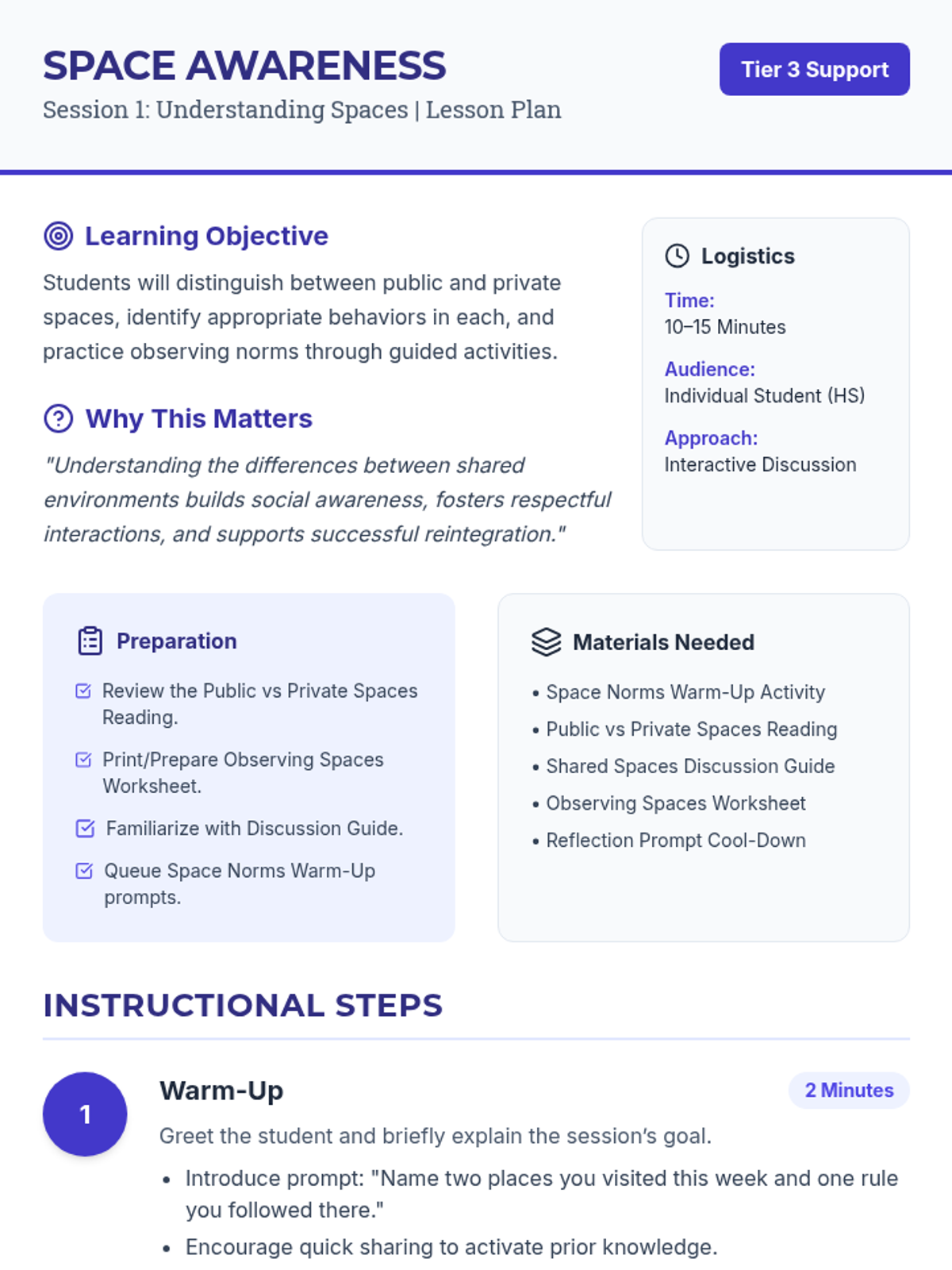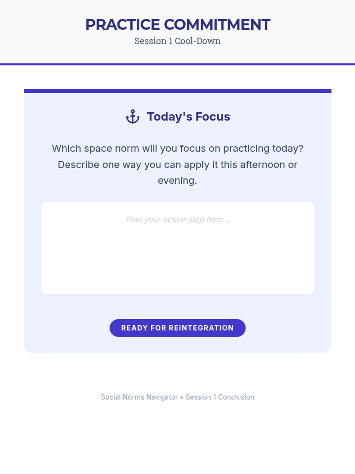 A targeted intervention sequence helping students navigate societal expectations and environment-specific behaviors for successful social reintegration.