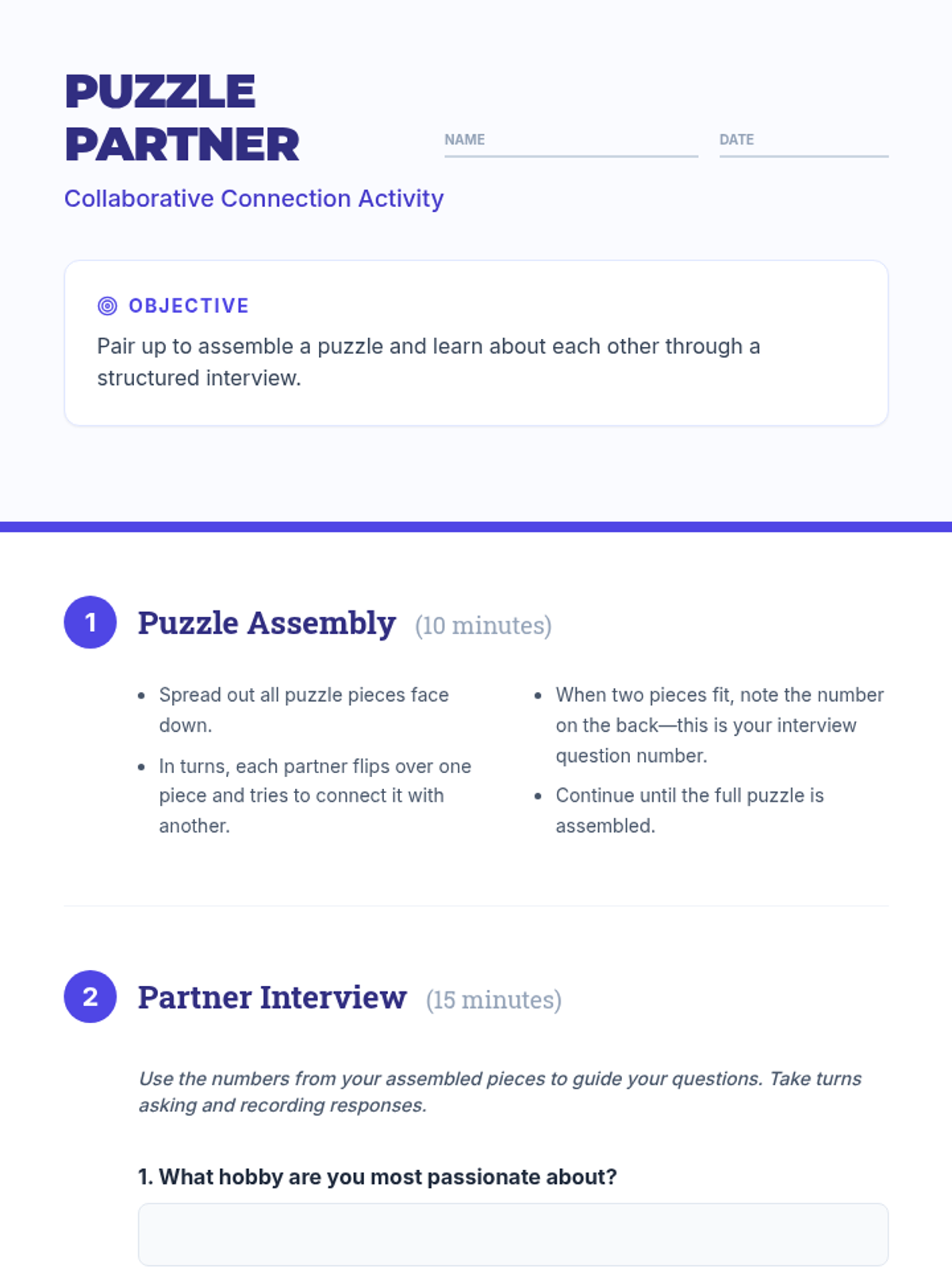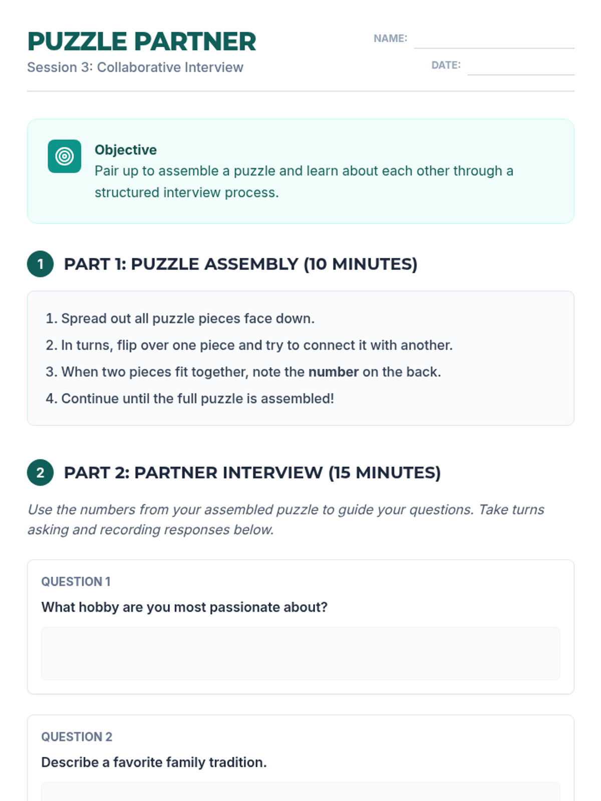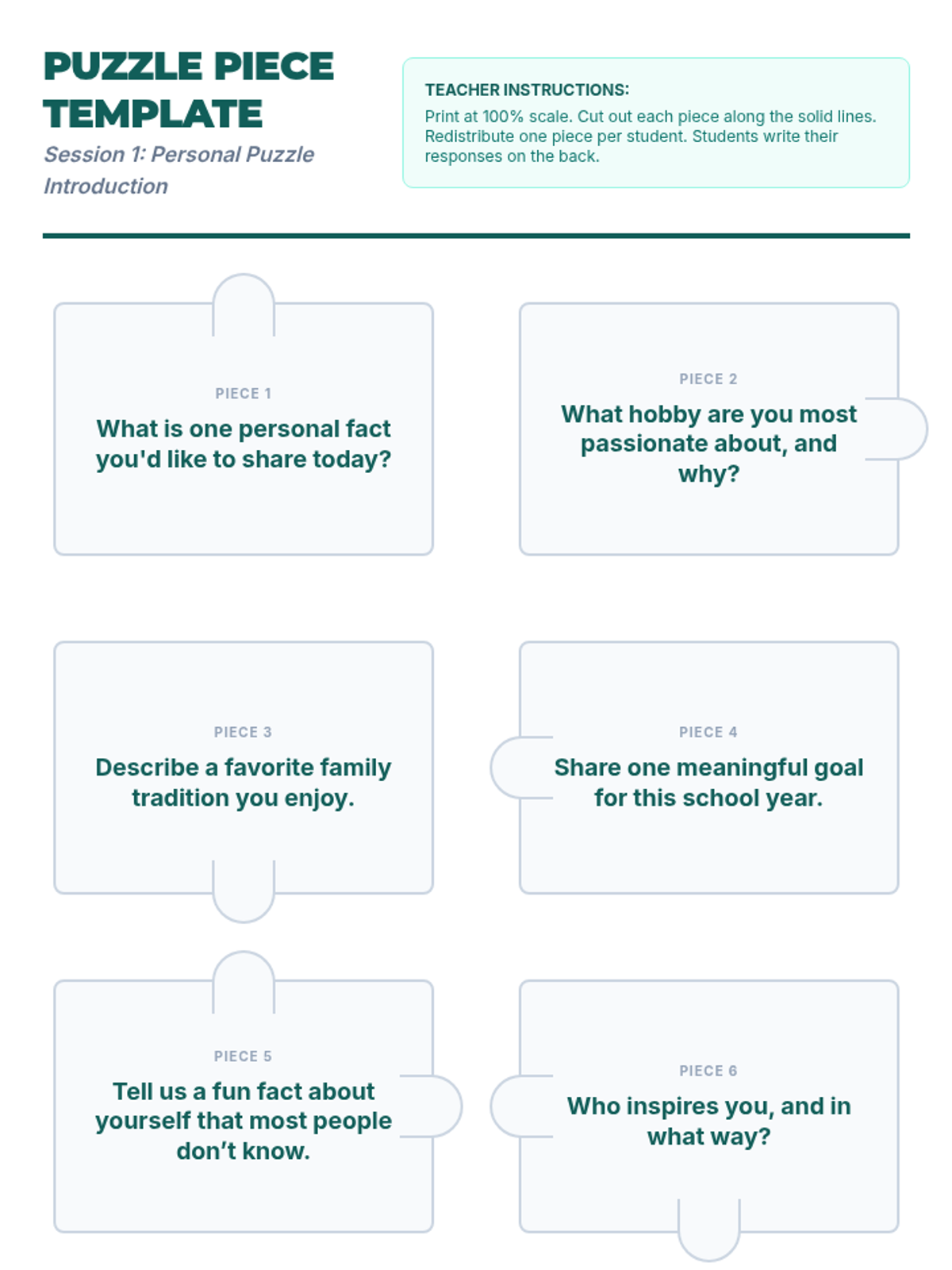 A four-session Tier 2 small group sequence designed to foster peer connections through collaborative puzzles and structured reflection. 10th grade students build social skills and classroom community through shared activities and deep conversation.